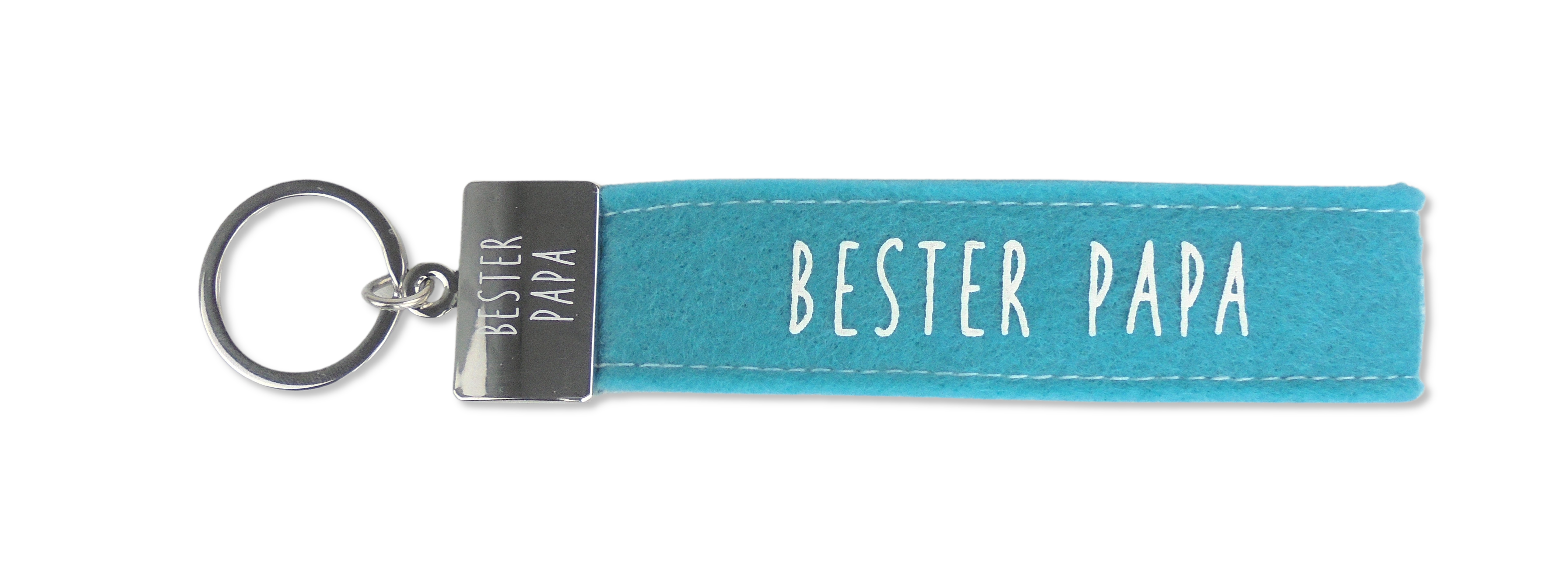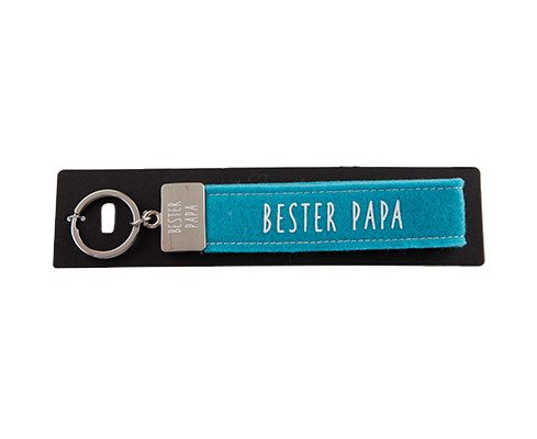 Dieser kultig bedruckte Schlüsselanhänger besteht aus einer Filzschlaufe, mit Sticknaht und einem Metallabschluss. Das Schlüsselband ist mit einem coolen, lustigem oder liebevollen Spruch auf der Vorderseite bedruckt. In diesem Fall ist das Filzband in der Farbe Türkis, mit der Aufschrift “Bester Papa”. Auf den Metallabschluss ist ebenfalls nochmal “Bester Papa” gedruckt.