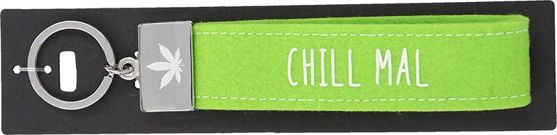 Dieser kultig bedruckte Schlüsselanhänger besteht aus einer Filzschlaufe, mit Sticknaht und einem Metallabschluss. Das Schlüsselband ist mit einem coolen, lustigem oder liebevollen Spruch auf der Vorderseite bedruckt. In diesem Fall ist das Filzband in der Farbe Grün mit der Aufschrift “Chill mal”. Auf dem Metallabschluss ist dazu ein Hanfblatt gedruckt.