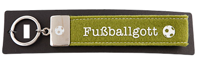 Dieser kultig bedruckte Schlüsselanhänger besteht aus einer Filzschlaufe, mit Sticknaht und einem Metallabschluss. Das Schlüsselband ist mit einem coolen, lustigem oder liebevollen Spruch auf der Vorderseite bedruckt. In diesem Fall ist das Filzband in der Farbe Grün, mit der Aufschrift “Fußballgott” und einem Fußball versehen. Auf den Metallabschluss ist ebenfalls nochmal ein Fußball gedruckt.