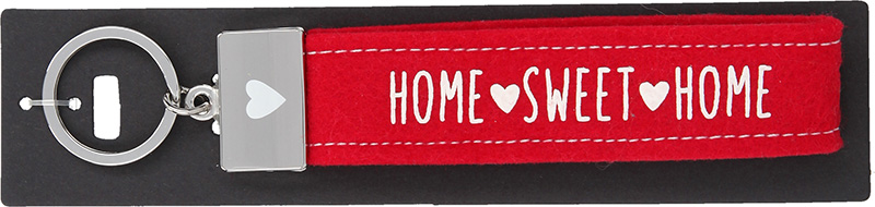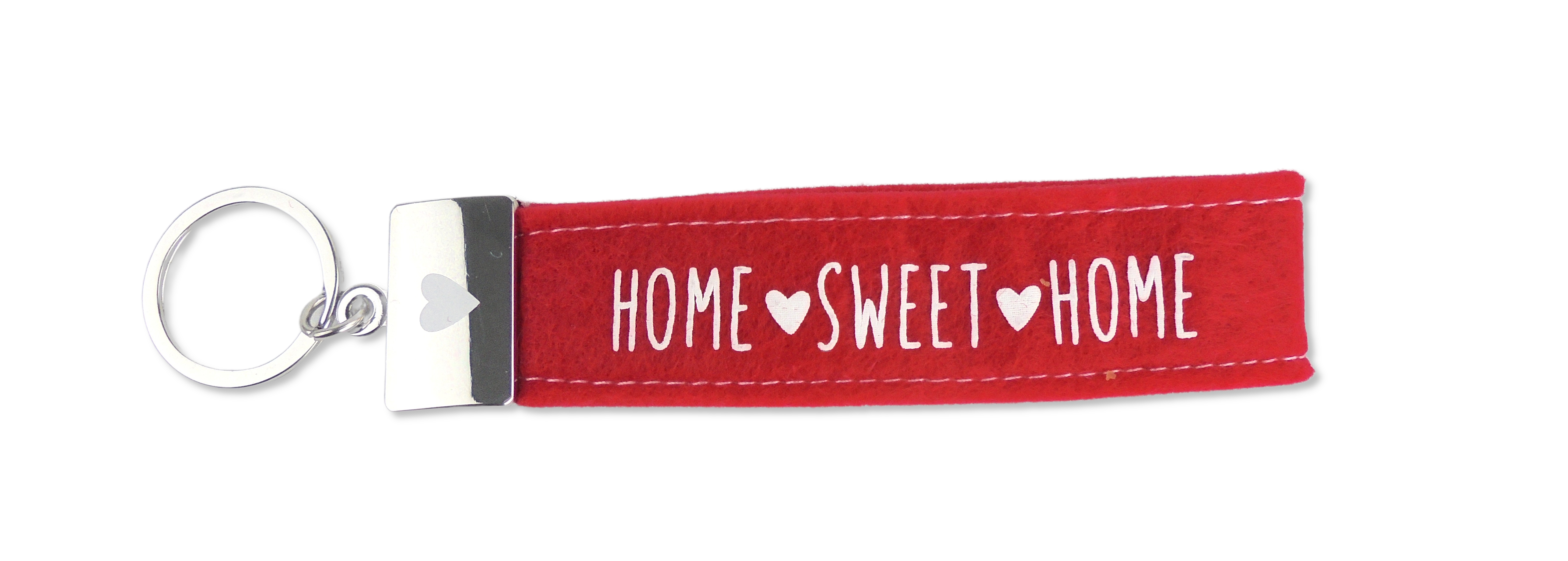 Dieser kultig bedruckte Schlüsselanhänger besteht aus einer Filzschlaufe, mit Sticknaht und einem Metallabschluss. Das Schlüsselband ist mit einem coolen, lustigem oder liebevollen Spruch auf der Vorderseite bedruckt. In diesem Fall ist das Filzband in der Farbe Rot, mit der Aufschrift “Home Sweet Home” und zwei Herzen versehen. Auf dem Metallabschluss ebenfalls nochmal ein Herz gedruckt.