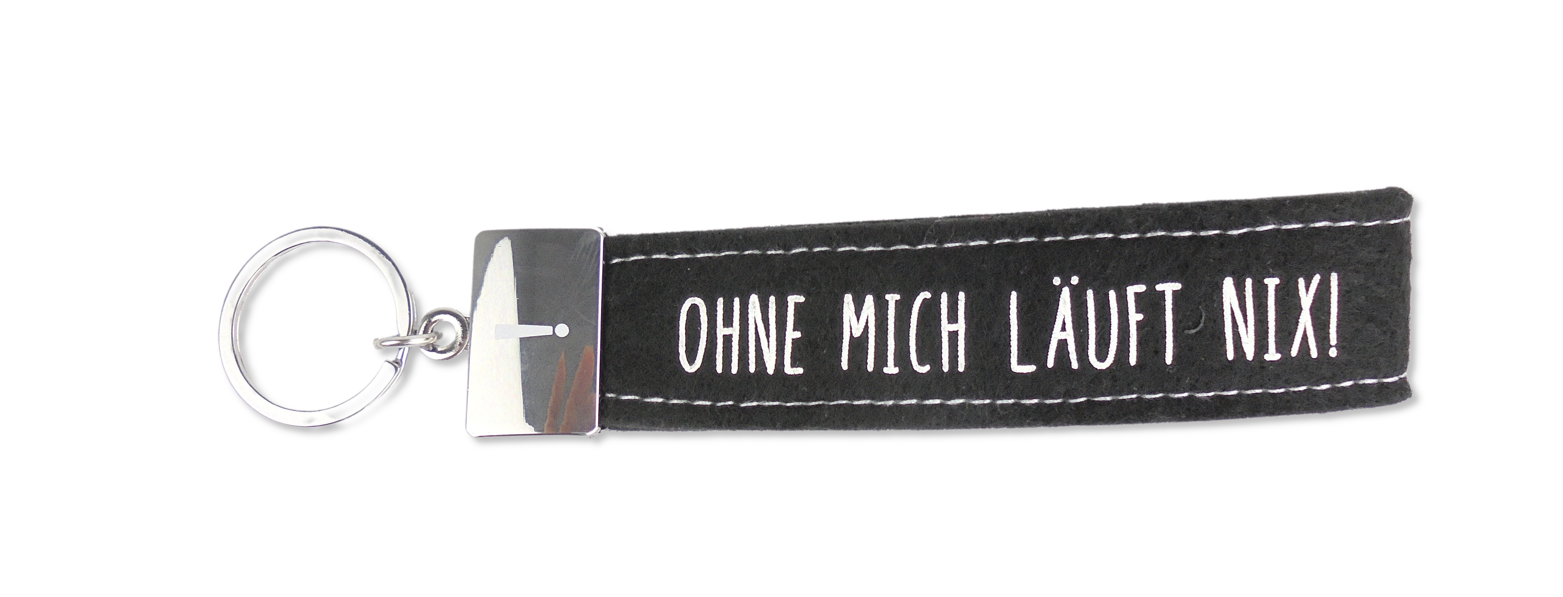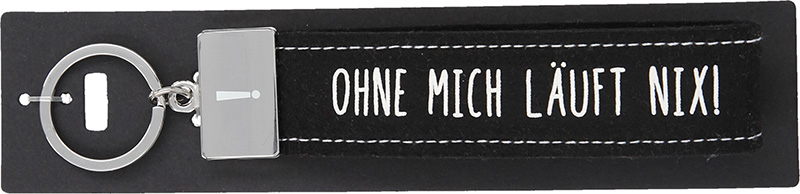 Dieser kultig bedruckte Schlüsselanhänger besteht aus einer Filzschlaufe, mit Sticknaht und einem Metallabschluss. Das Schlüsselband ist mit einem coolen, lustigem oder liebevollen Spruch auf der Vorderseite bedruckt. In diesem Fall ist das Filzband in der Farbe Schwarz, mit der Aufschrift “Ohne mich läuft nix!”. Auf dem Metallabschluss ist außerdem ein Ausrufezeichen gedruckt.