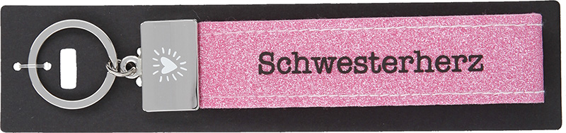 Dieser kultig bedruckte Schlüsselanhänger besteht aus einer Filzschlaufe, mit Sticknaht und einem Metallabschluss. Das Schlüsselband ist mit einem coolen, lustigem oder liebevollen Spruch auf der Vorderseite bedruckt. In diesem Fall ist das glitzernde Filzband in der Farbe Rosa, mit der Aufschrift “Schwesterherz”. Auf dem Metallabschluss ist außerdem passend dazu ein Herz gedruckt.
