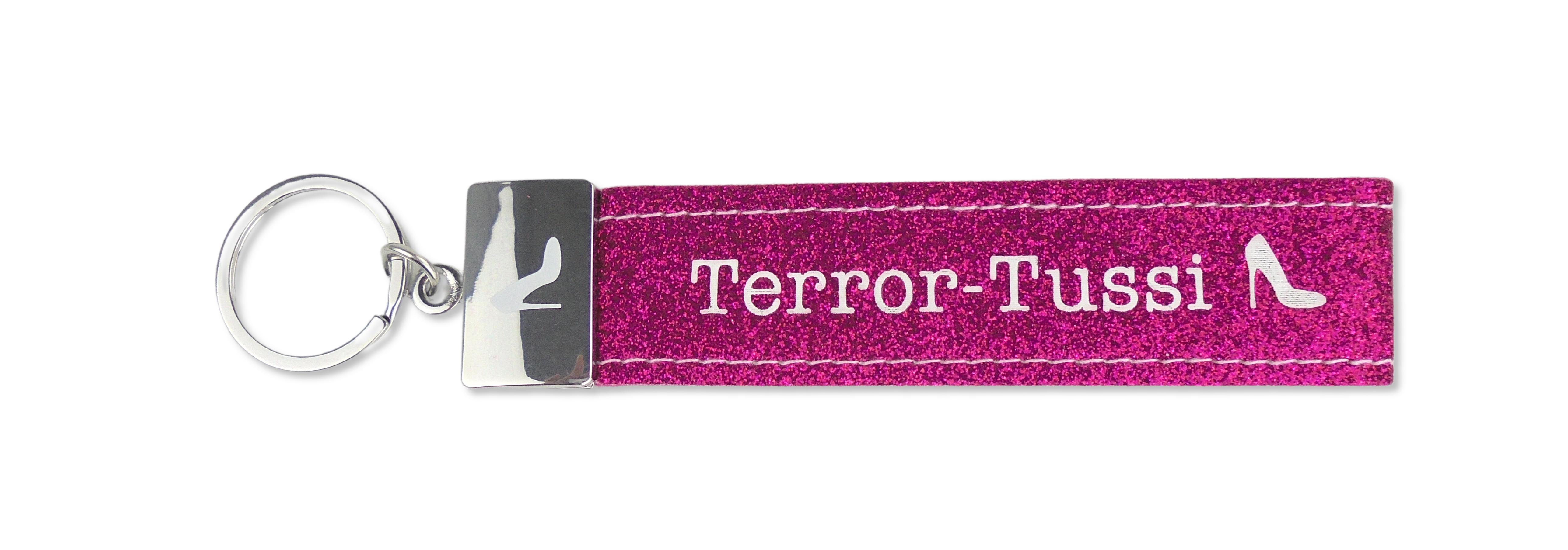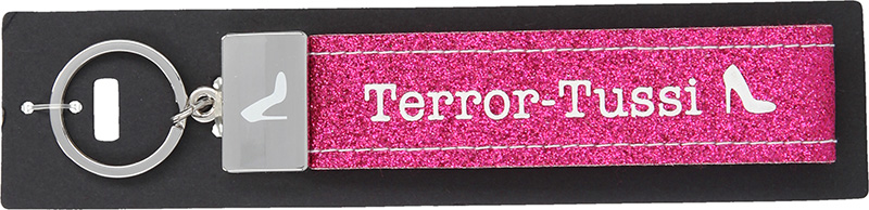 Dieser kultig bedruckte Schlüsselanhänger besteht aus einer Filzschlaufe, mit Sticknaht und einem Metallabschluss. Das Schlüsselband ist mit einem coolen, lustigem oder liebevollen Spruch auf der Vorderseite bedruckt. In diesem Fall ist das glitzernde Filzband in der Farbe Pink, mit der Aufschrift “Terror Tussi” und einem “High Heel Pumps” versehen. Auf dem Metallabschluss ist ebenfalls nochmal ein “High Heel Pumps” gedruckt.