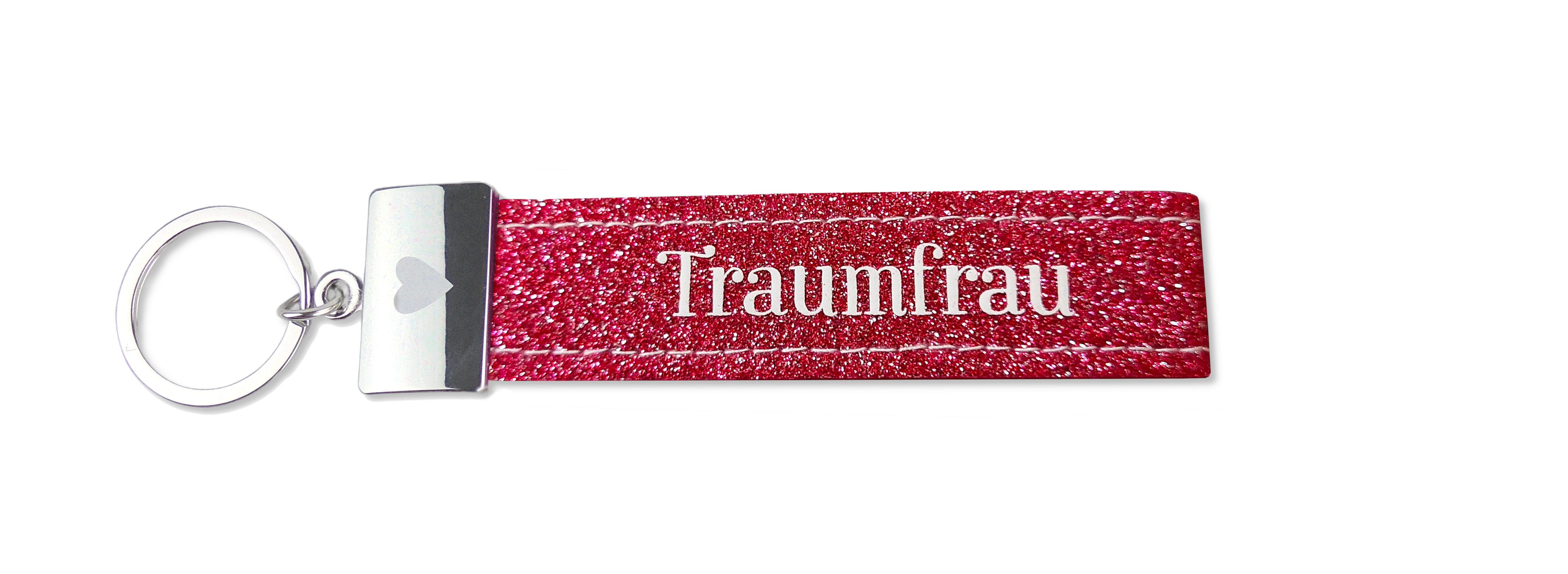Dieser kultig bedruckte Schlüsselanhänger besteht aus einer Filzschlaufe, mit Sticknaht und einem Metallabschluss. Das Schlüsselband ist mit einem coolen, lustigem oder liebevollen Spruch auf der Vorderseite bedruckt. In diesem Fall ist das glitzernde Filzband in der Farbe Pink, mit der Aufschrift “Traumfrau”. Auf den Metallabschluss ist außerdem ein Herz gedruckt.