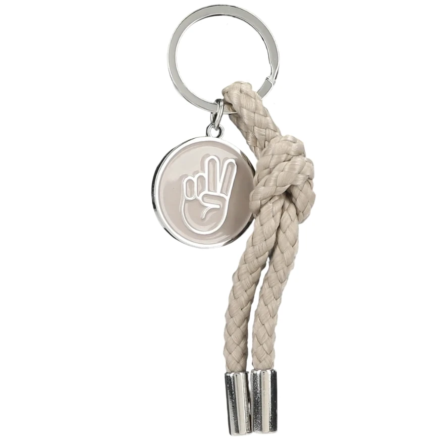 Die hellgraue, hochwertig geknotete Kordel strahlt Ruhe, Ausgeglichenheit und moderne Eleganz aus. Sie harmoniert perfekt mit den glänzenden, silberfarbenen Metall-Endkappen, die dem Anhänger ein edles Finish verleihen und für dauerhafte Haltbarkeit sorgen. Ebenso robust wie stilvoll ist der massive Schlüsselring, der Ihre Schlüssel sicher zusammenhält und sich mühelos in jedes Taschenformat einfügt.