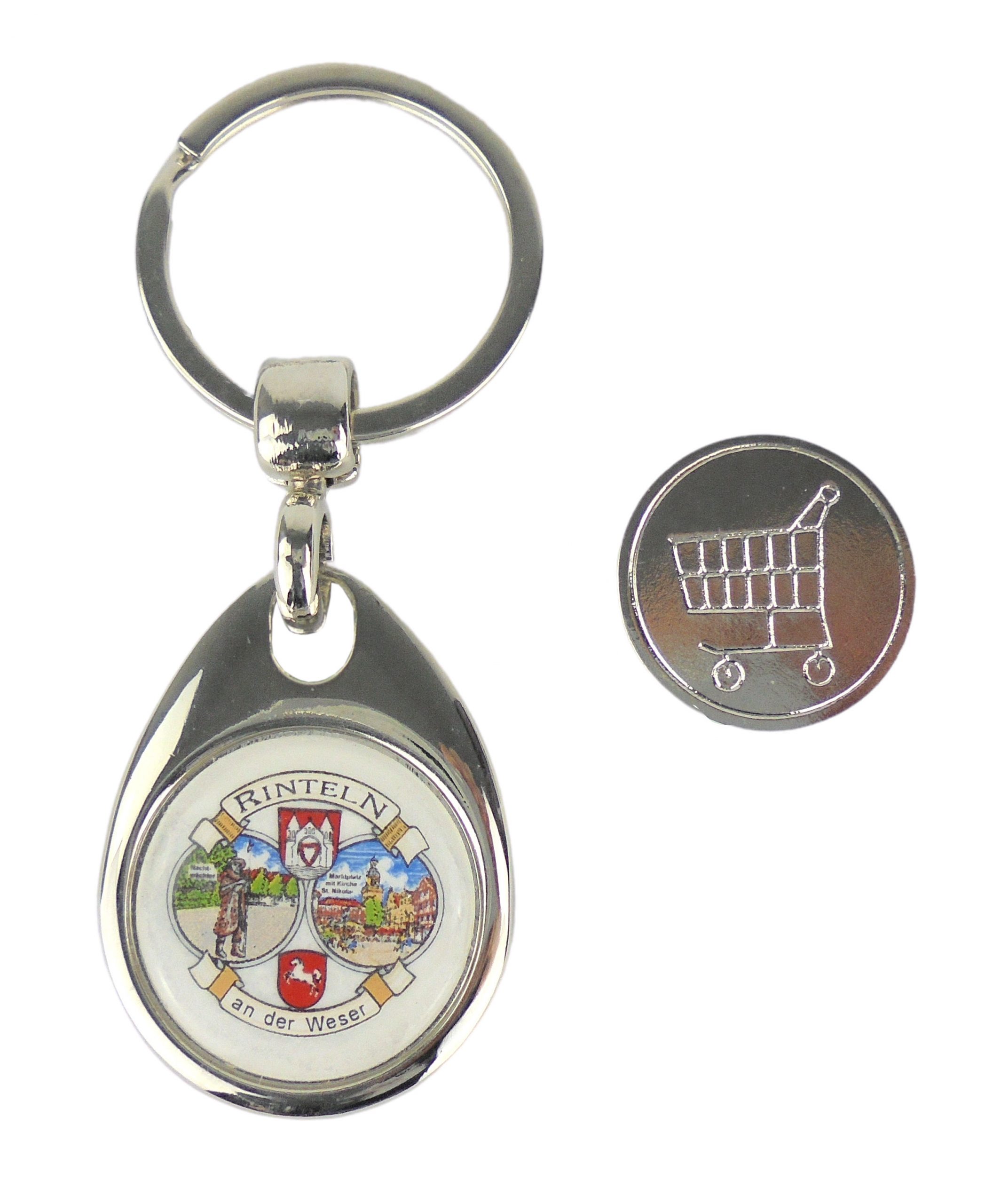 Ein besonderer Artikel aus dem Rinteln-Sortiment ist dieser Schlüsselanhänger mit integriertem Einkaufschip. Der Einkaufschip ist mit den Motiven des Marktplatzes von Rinteln, dem Nachtwächter, dem Wappen der Stadt-Rinteln, dem Niedersachsen-Wappen und dem Schriftzug: “Rinteln an der Weser” versehen.