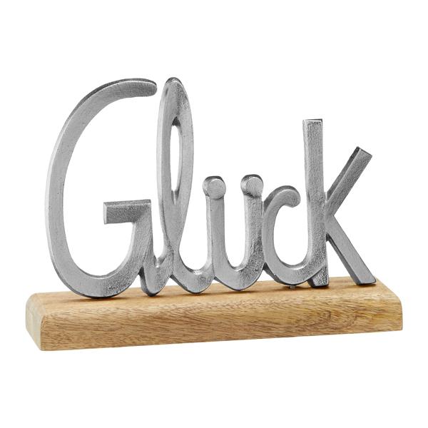 Deko-Schriftzug „Glück“ aus Aluminium auf Mangoholz-Sockel – Ein stilvoller Hingucker für dein Zuhause