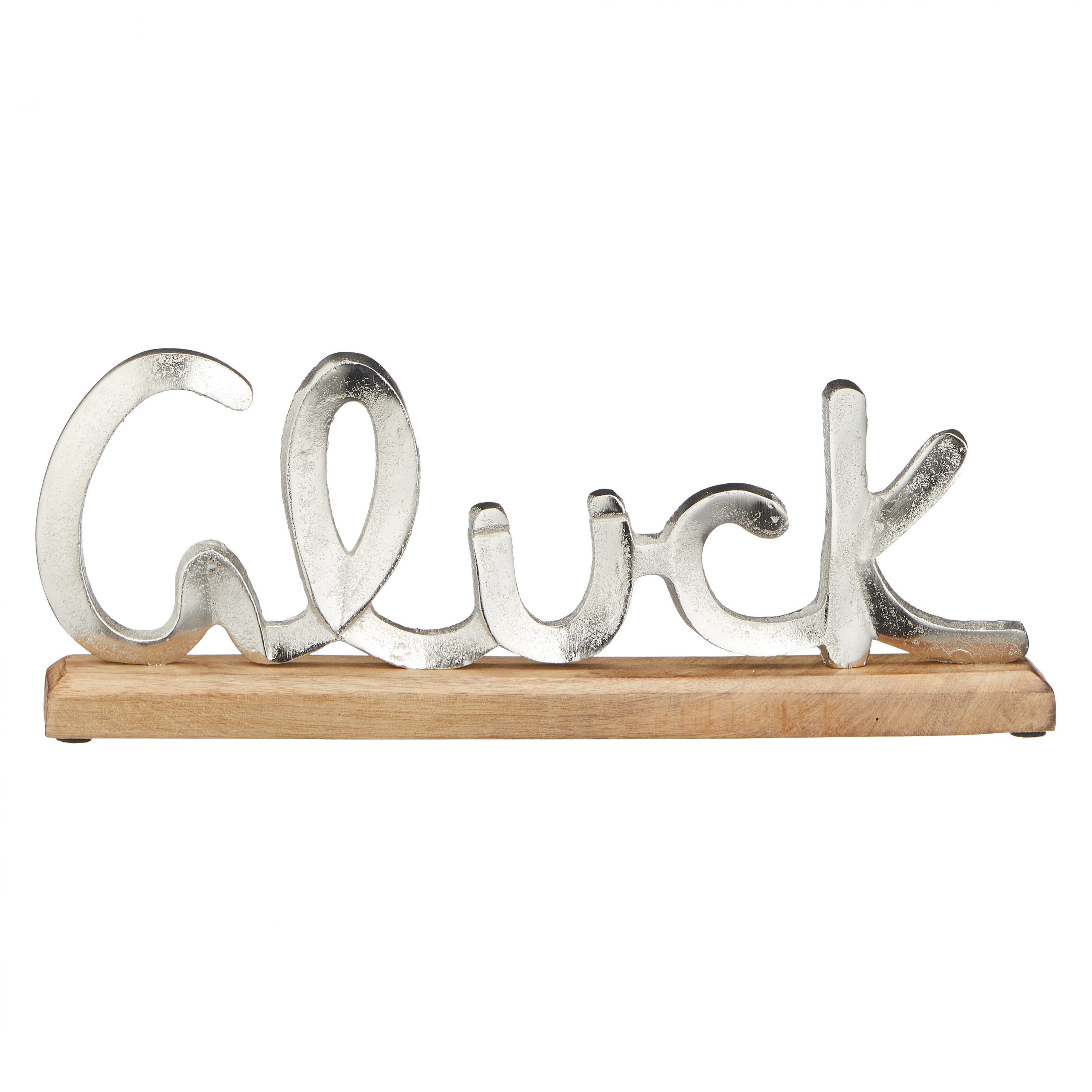 Deko-Schriftzug „Glück“ aus Aluminium auf Mangoholz-Sockel – Ein stilvoller Hingucker für dein Zuhause