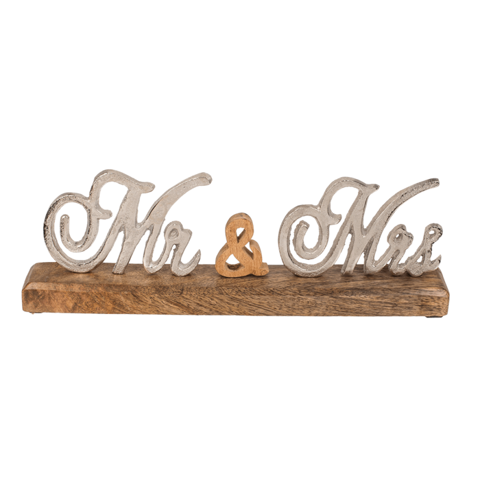 Der Schriftzug “Mr & Mrs” setzt ein romantisches Statement in jeder Einrichtung! Dieser Schriftzug eignet sich perfekt als hübsche Dekoration für den Geschenketisch oder die Brauttafel auf einer Hochzeit. Auch als nettes Geschenk für ein frisch vermähltes Paar ist er eine tolle Idee. Der Schriftzug selbst ist aus Aluminium gefertigt und auf einem Fuß aus natürlichem Holz befestigt. Dieser Material-Mix macht den Deko-Schriftzug universell einsetzbar, denn er passt zu nahezu jedem Einrichtungsstil!