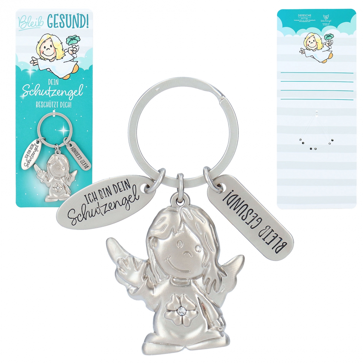 Der kleine Schutzengel Schlüsselanhänger Bleib gesund – Kleeblatt aus dem Hause Depesche trägt ein kleines, vierblättriges Kleeblatt auf der Brust, in dessen Mitte ein Schmuckstein eingelassen ist. Zusätzlich zu dem Engel selbst, sind an dem Schlüsselring noch 2 kleinere Anhänger befestigt. Auf dem einen grüßt dich das Engelchen mit den Worten “Ich bin dein Schutzengel”, den anderen ziert die Aufschrift “Bleib gesund!”.
