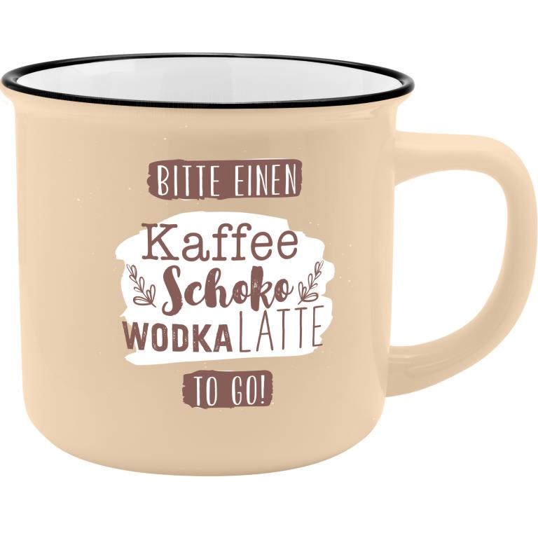 Dank seiner dekorativen Gestaltung in Kombination mit dem passenden Text “Bitte einen Kaffee Schoko Wodka Latte to go!” eignet sich der Trinkbecher wunderbar als kleines Geschenk.