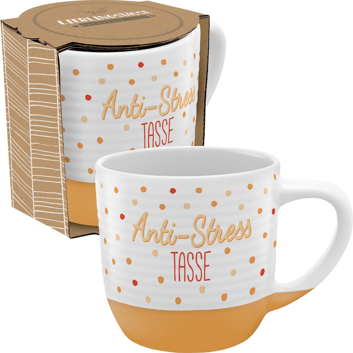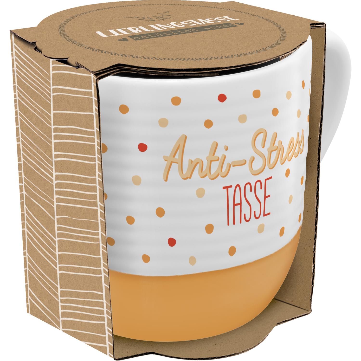 Die Sheepworld Lieblingstasse aus der GRUSS & CO Serie ist die perfekte Wahl, um dem Stress des Alltags zu entfliehen. Mit dem inspirierenden Spruch „Anti-Stress Tasse“ erinnert sie dich daran, das Leben zu genießen. Die Tasse hat eine Grundfarbe in strahlendem Weiß, die für Ruhe und Ausgeglichenheit steht. Ihre charmanten Rillen verleihen ihr eine einzigartige Textur, die angenehm in der Hand liegt. Der getauchte Tassenboden in leuchtendem Orange setzt einen fröhlichen Akzent und sorgt für guten Laune. Mit einem Fassungsvermögen von 400 ml bietet sie ausreichend Platz für Ihren Lieblingskaffee oder Tee. Hergestellt aus hochwertigem Steinzeug, ist es robust und langlebig. Zudem ist sie spülmaschinengeeignet, was die Reinigung zum Kinderspiel macht.