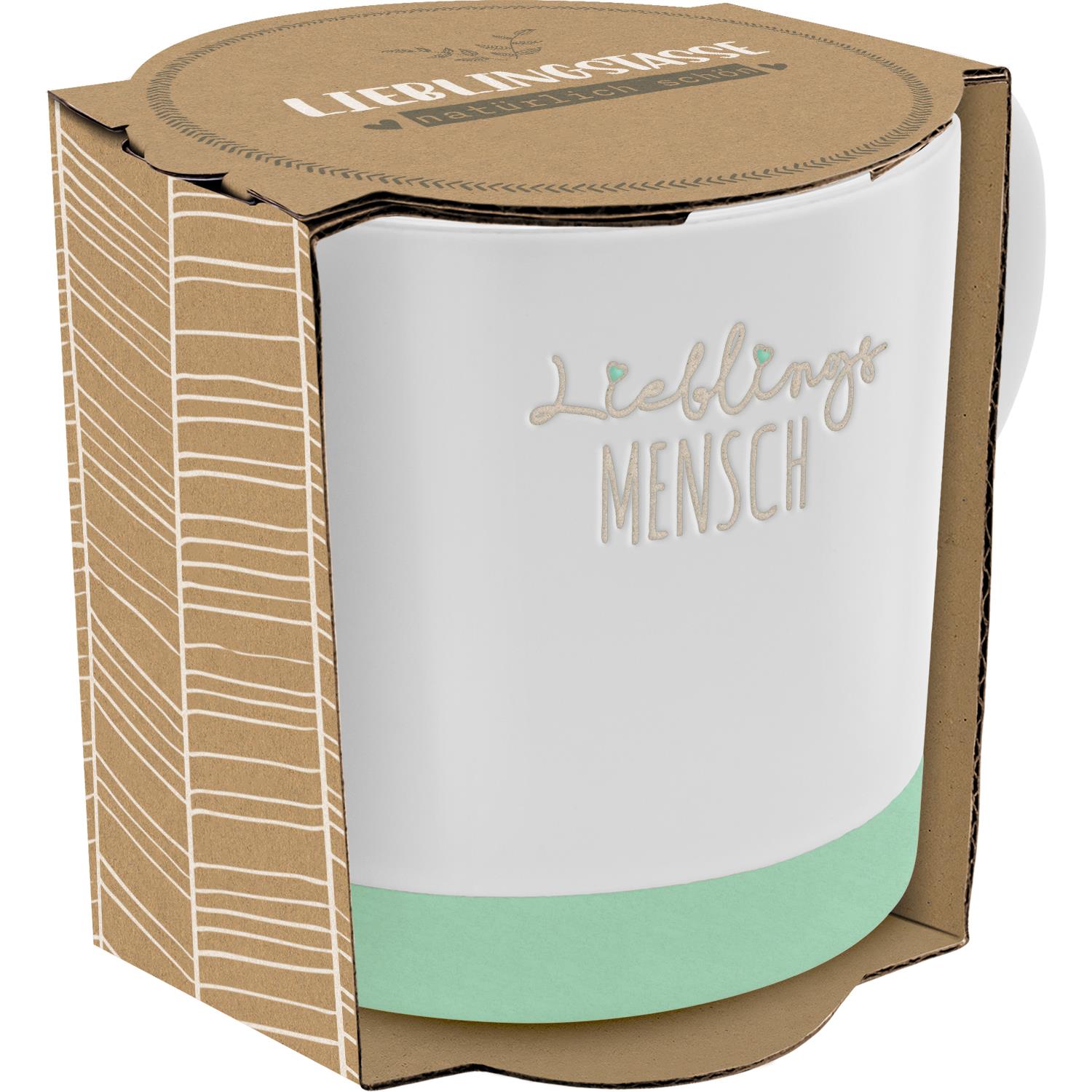 Die Sheepworld GRUSS & CO Lieblingstasse ist ein absolutes Must-Have für jeden Lieblingsmenschen! Mit der Gravur „Lieblingsmensch“ wird diese Tasse zu einem ganz besonderen Geschenk. Der grüne Tassenboden verleiht der Tasse einen frischen und einzigartigen Look. Mit einem Fassungsvermögen von 400 ml bietet sie genug Platz für den perfekten Kaffeegenuss. Das schlichte Design passt in jeden Haushalt und sorgt für eine gemütliche Atmosphäre. Verpackt in einer wundervollen Geschenkbanderole aus Kraftpapier ist diese Tasse das ideale Einzugsgeschenk für deinen Lieblingsmenschen. Zeige deine besondere Person, wie viel sie dir bedeutet, denn Lieblingsmenschen verdienen nur das Beste! Hol dir jetzt diese natürliche Tasse mit Lieblingsmensch-Gravur und bereite deinen Lieblingsmenschen eine Freude, die er nicht vergessen wird.