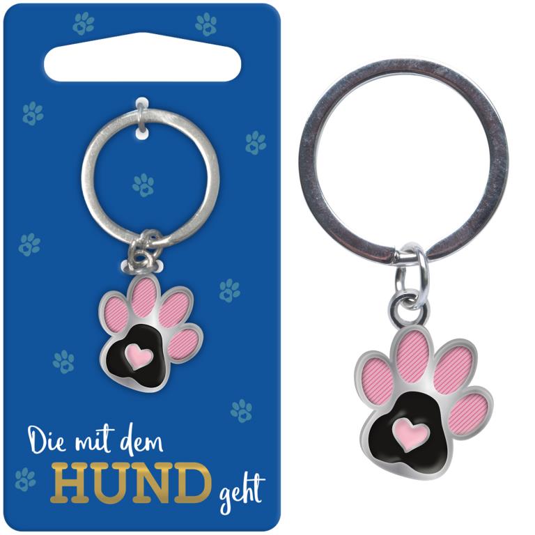 Ob als Geschenk oder einfach nur so, eine tolle Idee jemanden zu überraschen. Dieser Schlüsselanhänger mit dem Motivdruck einer Hundepfote und dem Text auf dem Header: “Die mit dem Hund geht”, sagt aus: Die Besitzerin dieses Schlüsselanhängers geht regelmäßig mit ihrem Hund spazieren.