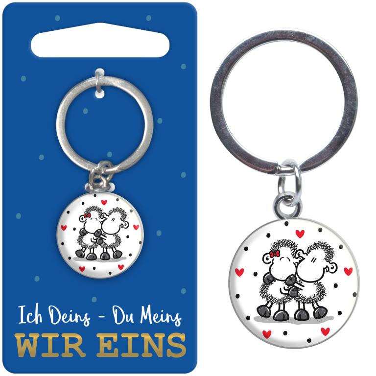 Ob als Geschenk oder einfach nur so, eine tolle Idee jemanden zu überraschen. Dieser Schlüsselanhänger mit dem Aufdruck, des für Sheepworld, typischen Schafes als Paar mit vielen kleinen roten Herzen und dem Text auf dem Header: Ich Deins – Du Meins – WIR EINS – , soll innige Liebe symbolisieren.