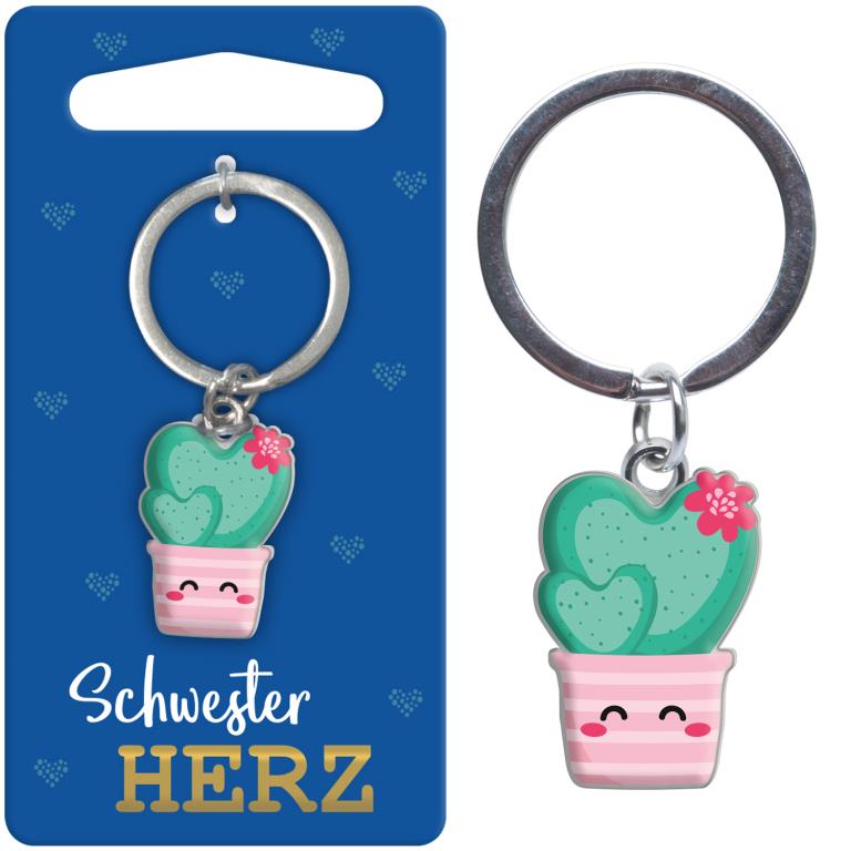 Ob als Geschenk oder einfach nur so, eine tolle Idee dein “Schwesterherz” zu überraschen. Dieser Schlüsselanhänger mit dem Motivdruck eines kleinen und eines großen herzförmigen Kaktus mit einer Blüte und dem originellen Blumentopf dazu, ist bestimmt genau das Richtige für sie.