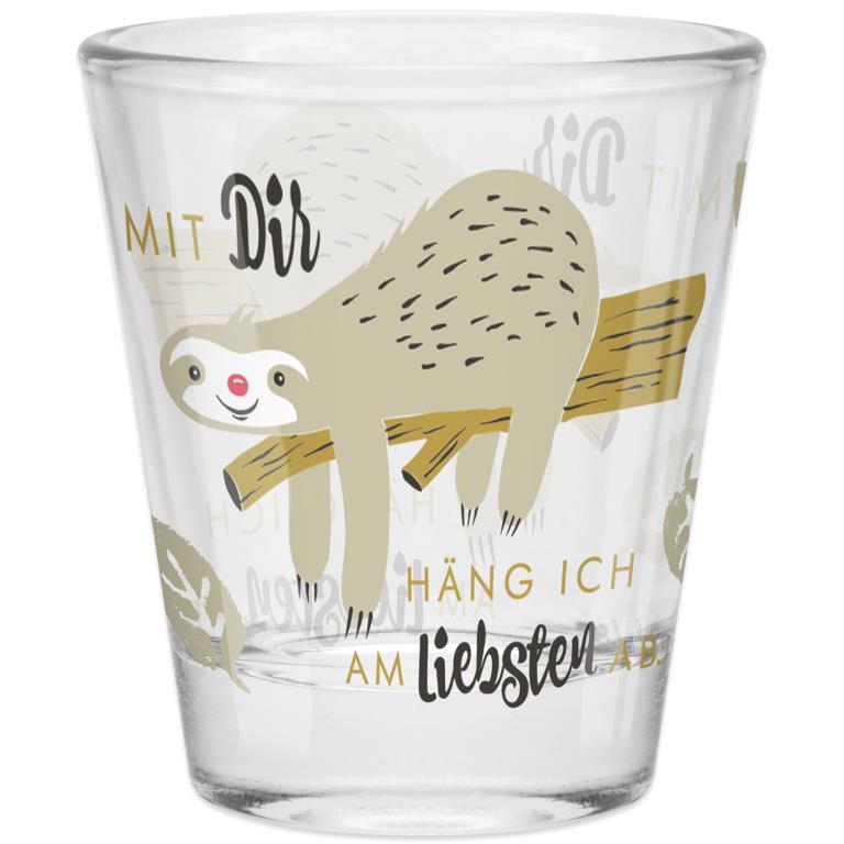 Das Sheepworld Schnapsglas “Mit Dir” ist das perfekte Geschenk für alle, die ihre Zeit gerne mit besonderen Menschen verbringen. Der liebevolle Spruch „Mit Dir häng ich am liebsten ab“ auf diesem Glas kommt zusammen mit einem niedlichen Faultier, das gemütlich an einem Ast hängt. Umrahmt von zarten Baumblättern und in sanften Farben wie Grau und Gold gehalten, wirkt das Design sowohl verspielt als auch edel – einfach perfekt für einen Menschen, der einem am Herzen liegt.