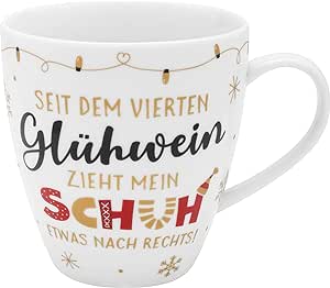 Das auffällige Design dieser Tasse fängt den Charme des Weihnachtsmarktes ein. Auf der Vorderseite prangt der humorvolle Spruch: “Seit dem vierten Glühwein zieht mein Schuh etwas nach rechts!” – eine lustige Anspielung auf die wohlige Wärme und den Genuss, den Glühwein verbreitet. Das Motiv auf der Tasse zeigt eine winterliche Szene, die die Vorfreude auf die kalte Jahreszeit weckt.