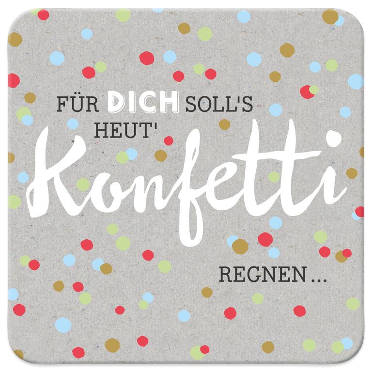 “Für dich soll´s heut´ Konfetti regnen…” ist ein toller Untersetzer, der in seiner schlichten Farbgestaltung und dem Schriftzug einen besonderen Tag vermitteln soll. Präsentiere auf diesem Untersetzer ein tolles Getränk und gib so dein Statement weiter oder benutze ihn als Dekoelement in einem Präsent, z.B. zum Geburtstag oder einer anderen passenden Gelegenheit.