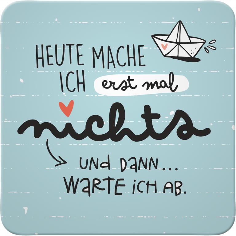 “Heute mach ich erstmal nichts und dann warte ich ab” ist ein toller Untersetzer, der in seiner türkisen Farbgestaltung mit kleinem Papierboot und dem Schriftzug ein Statement setzt, welches zu den meisten Personen passt. Präsentiere auf diesem Untersetzer ein tolles Getränk und gib so dein Statement weiter oder benutze ihn als Dekoelement in einem Präsent, z.B. zum Geburtstag oder einer anderen passenden Gelegenheit.