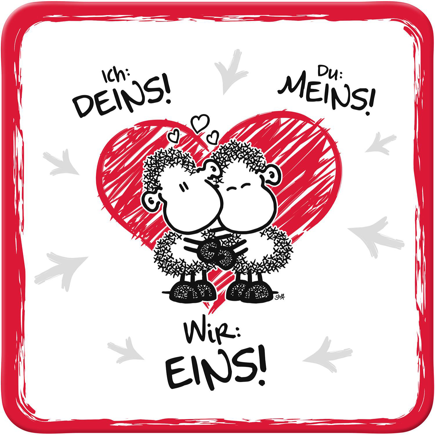 Mit einem Motiv, das zwei verliebte Schafe zeigt, die eng aneinander gekuschelt sind, strahlen die Untersetzer eine unwiderstehliche Zuneigung aus. Begleitet wird das entzückende Bild von einem charmanten Spruch: “Ich: DEINS! – Du: MEINS! – Wir: EINS!” – Ein Ausdruck von Liebe, der direkt ins Herz geht und ein Lächeln auf Ihre Lippen zaubert.