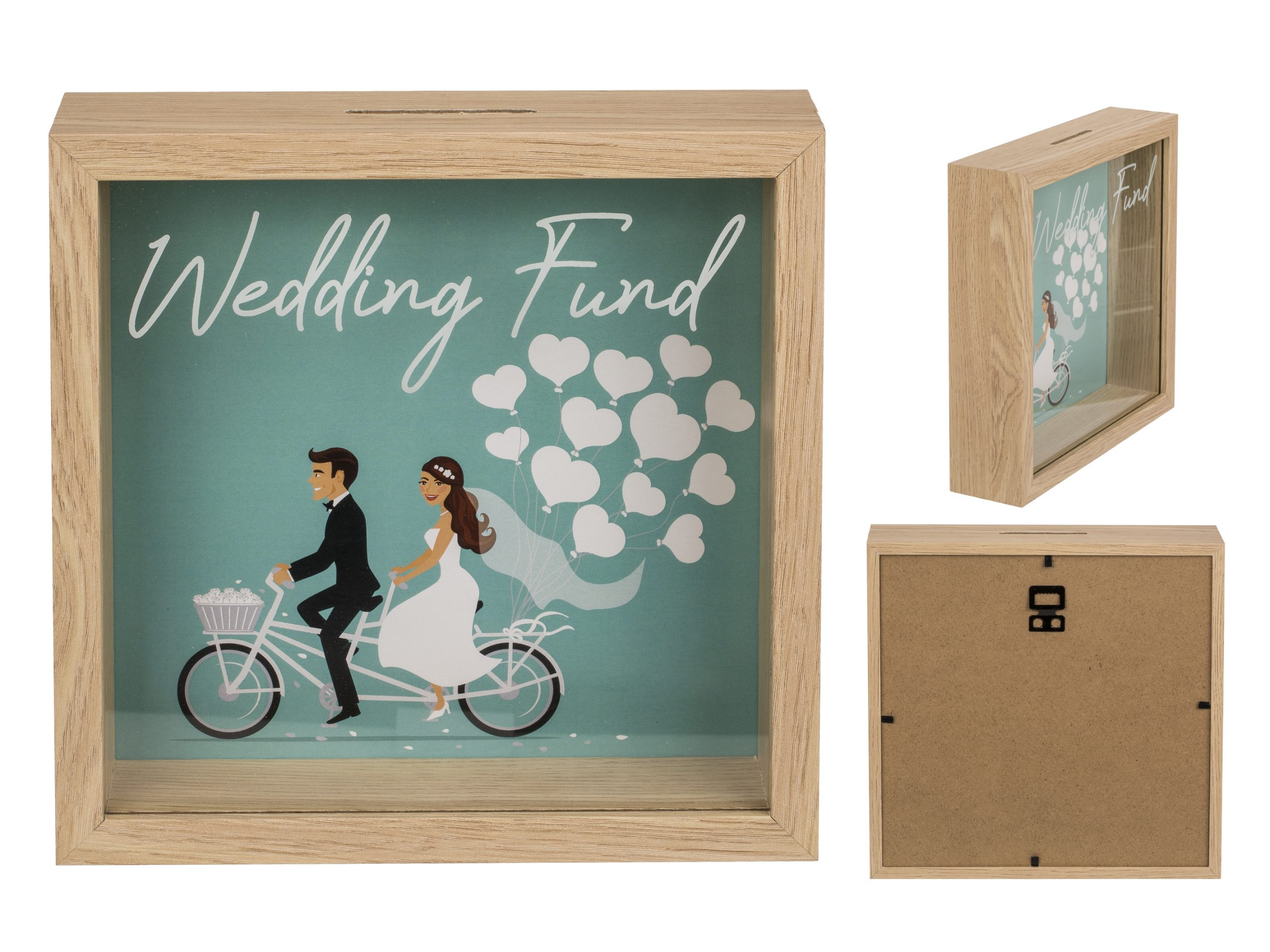 Sie können diesen Bilderrahmen natürlich auch einfach so als Spardose verwenden um darin Geld zu verschenken. Das Geld in dieser Spardose ist sichtbar, denn sie besteht aus einer Glasfront mit der Aufschrift: Hochzeits-Kasse.