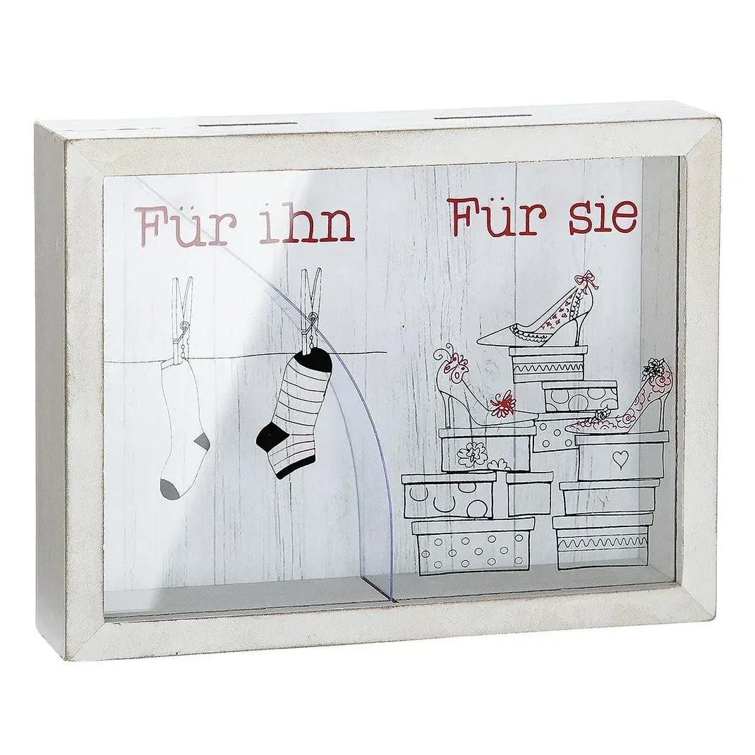 Zwei separate Einwurfschlitze laden dazu ein, Geldscheine oder kleine Nachrichten „geschlechtergetrennt“ einzuwerfen. Eine fest eingebaute Trennwand sorgt dafür, dass – ganz zur Freude der Braut – das gesamte Ersparte auf ihrer Seite landet. Auf der Glasfront zeigt sich der Witz dieses Geschenks besonders schön: Während auf seiner Seite lediglich zwei Socken auf einer Wäscheleine hängen, stapeln sich auf ihrer Seite zahlreiche Schuhkartons – gekrönt von schicken Highheels. Eine herrlich überzeichnete Darstellung, die mit einem Augenzwinkern auf klassische Klischees anspielt.