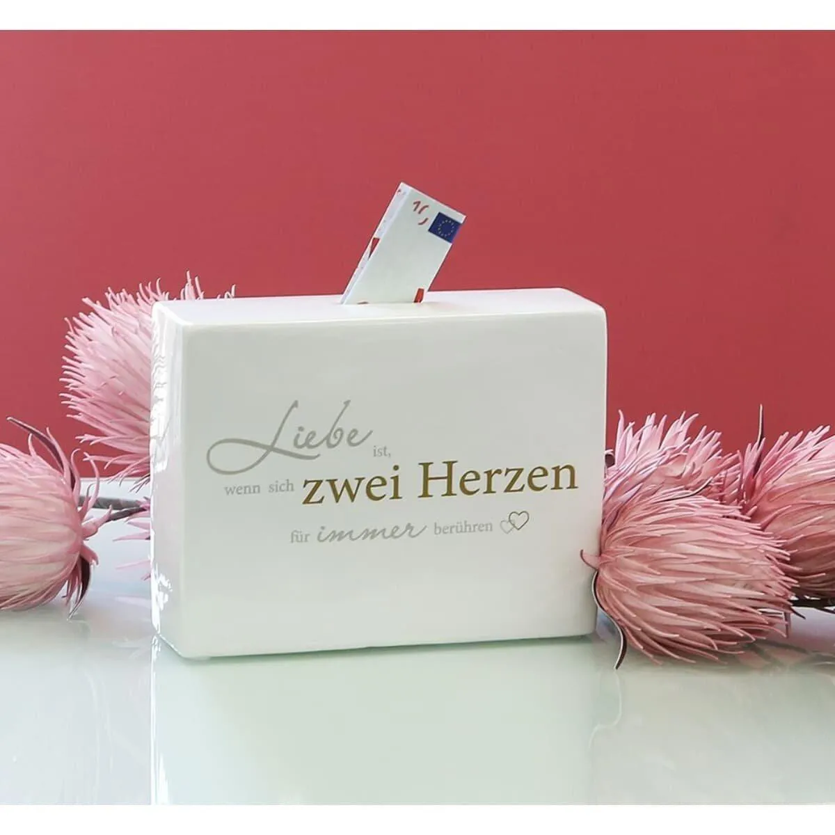 Liebe beginnt mit einem Gefühl – doch sie wächst durch gemeinsame Träume. Die Spardose „Herz an Herz“ ist mehr als nur ein hübsches Dekostück. Sie ist ein Symbol für Zusammenhalt, für gemeinsame Pläne und für die Magie, wenn zwei Herzen dauerhaft im Einklang schlagen. Auf der Vorderseite der weißen, glänzend glasierten Spardose steht in feiner Schrift: „Liebe ist, wenn sich zwei Herzen für immer berühren.“ Zwei zarte, ineinander verschlungene Herzen in Silber und Gold unterstreichen diese Botschaft auf elegante Weise.
