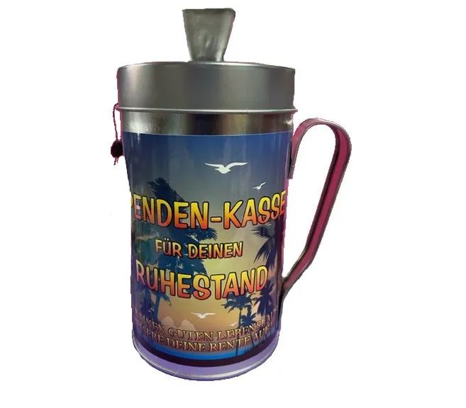 Die “Spenden-Kasse für deinen Ruhestand” hat das perfekte Design: Ein wunderschöner Palmenstrand im Abendlicht ziert die Dose. Dieses Bild weckt sofort Vorfreude auf sonnige, stressfreie Tage. Der Schriftzug „Für einen guten Lebenslauf, bessere deine Rente auf!“ sorgt für einen humorvollen Akzent. So wird jeder Blick auf die Dose zu einem Lächeln.