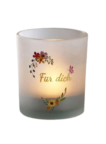 Das hochwertige Milchglas sorgt nicht nur für ein angenehmes Licht, sondern auch für eine stilvolle Optik. Die zarte Transparenz des Glases lässt das Licht sanft durchscheinen und verleiht den Gläsern eine edle Note. Die Blumen um den Spruch „Für dich“ verleihen den Gläsern einen romantischen Touch und machen sie zu einem echten Blickfang in jedem Raum.