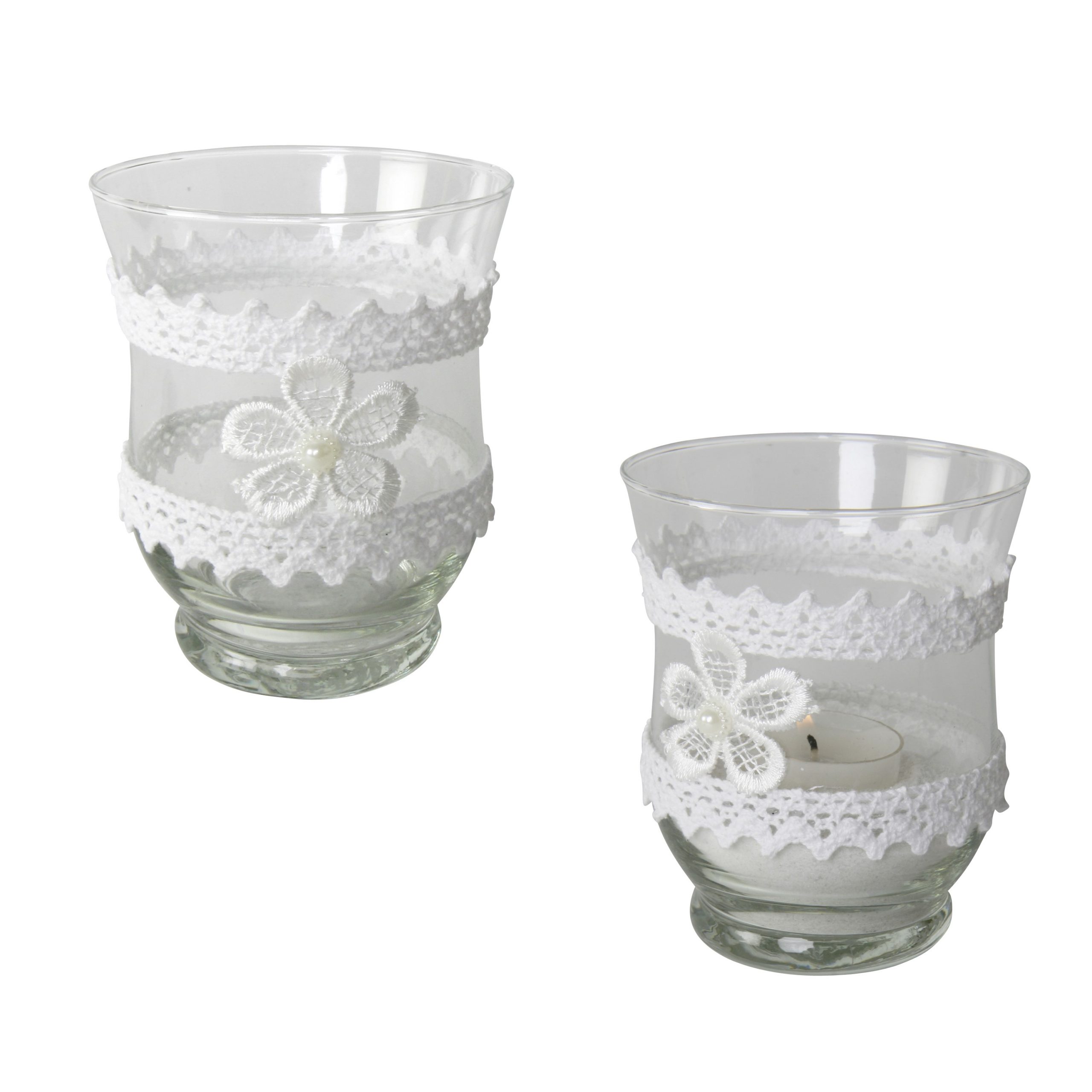 Verspielt mit der Spitzenbordüre und der kleinen Blüte wirkt dieses Teelicht-Kerzenglas auch als kleine Vase besonders schön.
