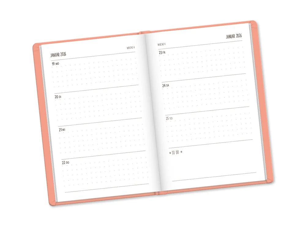 Im Inneren überzeugt der Planer durch eine übersichtliche Wochenaufteilung auf jeweils einer Doppelseite. So behältst Du jederzeit den Überblick über Deine Termine, Aufgaben und To-dos. Zusätzlich findest Du ausreichend Platz für Notizen, Gedanken, Ideen oder kleine Erinnerungen – alles, was Dir wichtig ist, hat hier seinen Platz.