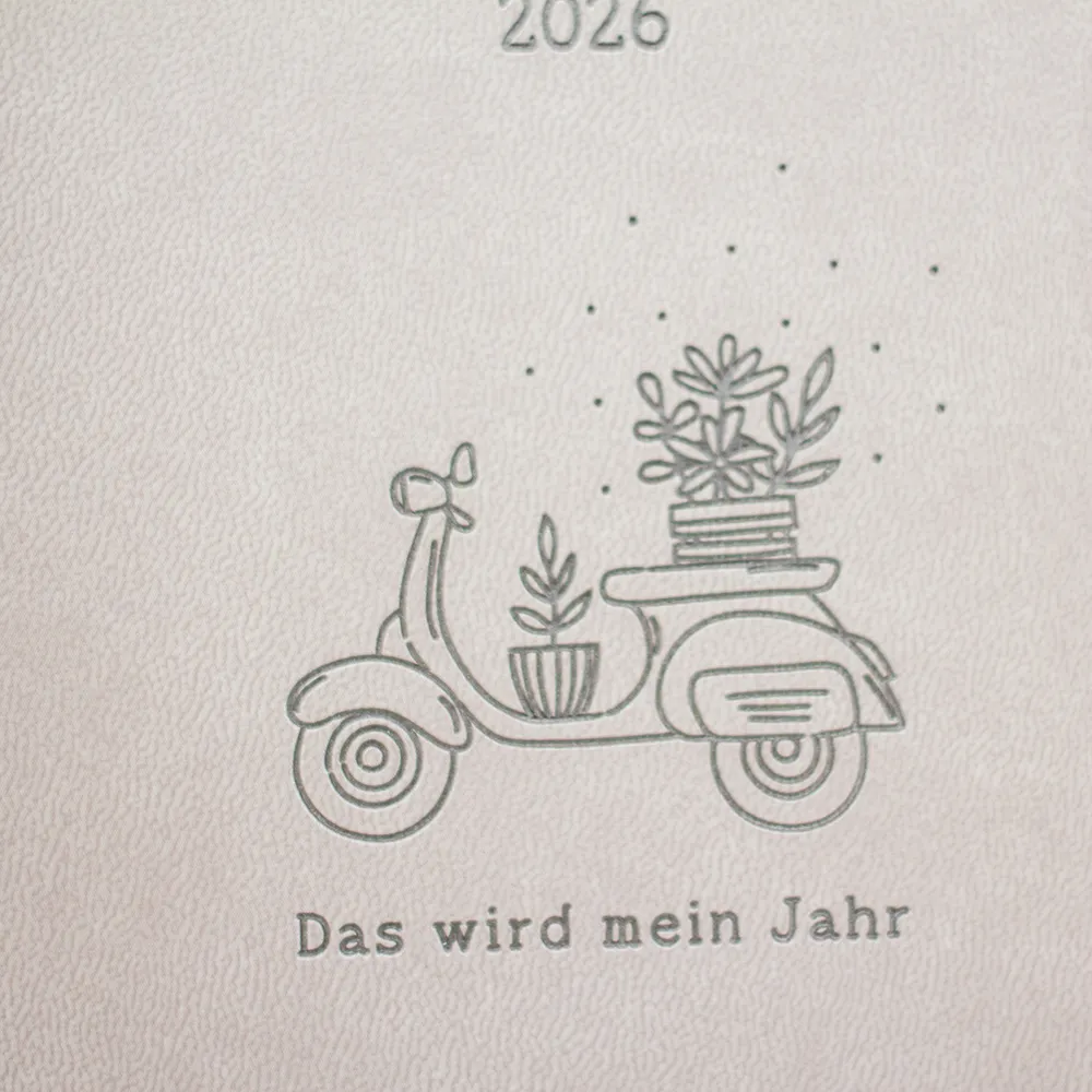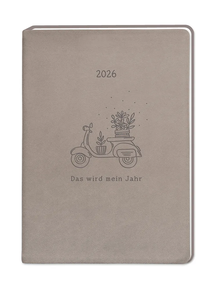 Mit dem stilvollen Terminplaner „Das wird mein Jahr“ 2026 beginnt Dein persönliches Abenteuer. In einem edlen Taupe-Ton gehalten und mit einem charmanten Motiv – einem Roller voller blühender Pflanzen – weckt dieser Kalender Vorfreude auf ein Jahr voller Möglichkeiten. Der geprägte feine Schriftzug „Das wird mein Jahr“ ist nicht nur ein Statement, sondern ein echtes Versprechen: Dieser Planer wird Dich motivieren, inspirieren und durch das Jahr begleiten.