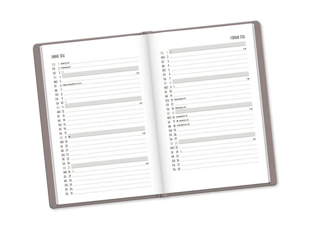 Dank des Satin-Lesezeichens hast Du Deine aktuelle Woche immer schnell zur Hand. Die stabile Fadenheftung sorgt für eine lange Lebensdauer, ob im Büro, in der Tasche oder auf Reisen.
