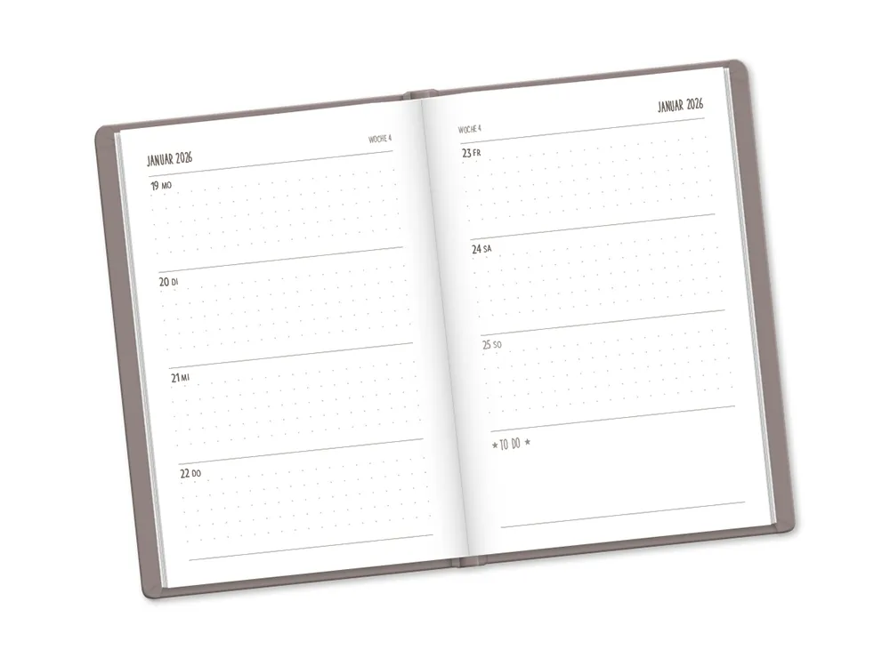 Das hochwertige Softcover im Lederlook liegt angenehm in der Hand und überzeugt mit seiner robusten, unempfindlichen Oberfläche. Die feine Prägung auf dem Cover verleiht dem Terminplaner eine exklusive Optik, die durch die detailverliebte Illustration zusätzlich aufgewertet wird. Innen erwartet Dich ein durchdachtes Layout: Jede Woche ist übersichtlich auf einer Doppelseite dargestellt – genug Platz für Termine, To-dos und Notizen. Zusätzliche Monats- und Jahresübersichten helfen bei der langfristigen Planung.