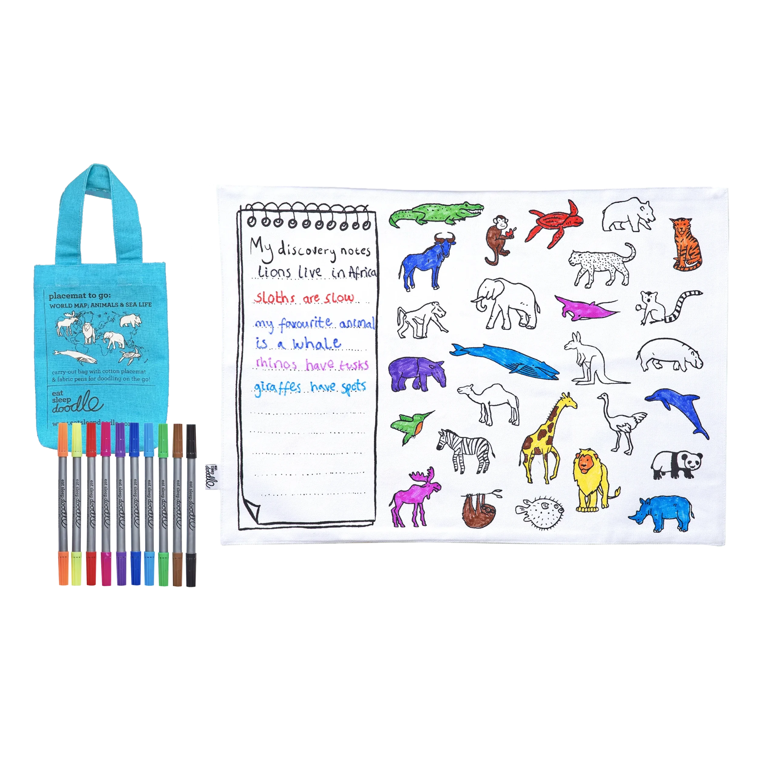 Das Tischset zeigt eine detailreiche Weltkarte mit einer Vielzahl an Land- und Meerestieren aus unterschiedlichen Regionen der Erde. Mit dem mitgelieferten Set auswaschbarer Filzstifte können die Kinder ihrer Kreativität freien Lauf lassen, während sie gleichzeitig etwas über Geographie und Tiere lernen. Zusätzlich bietet das Tischset Platz für eigene Notizen – kleine Naturforscher können ihre persönlichen Entdeckungen direkt auf das Set schreiben!