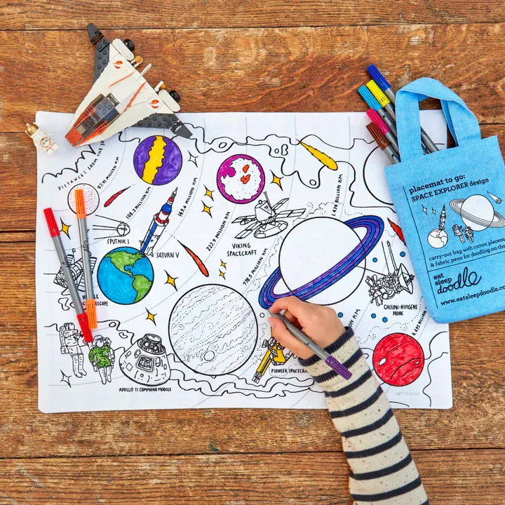 Mit diesem einzigartigen, ausmalbaren Tischset tauchen kleine Weltraumforscher in die faszinierende Welt unseres Sonnensystems ein! Das kreative und lehrreiche Tischset bietet eine spannende Reise durch unser Sonnensystem – ausgestattet mit zehn speziellen Stoffmalstiften, die sich problemlos auswaschen lassen.