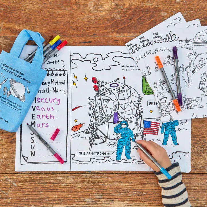 Lass die Fantasie auf eine intergalaktische Reise gehen – mit dem ausmalbaren Tischset “Weltraumforscher”!