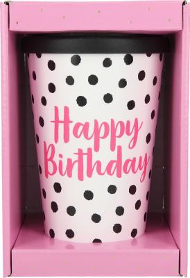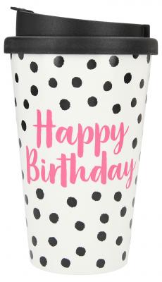 Dieser stylishe weiße Trinkbecher mit dem Spruch Happy Birthday mit schwarzen Punkten für unterwegs sorgt für beste Laune. Ob heißer Tee, kühle Limo oder Wasser: Dank der verschließbaren Trinköffnung geht nichts daneben.