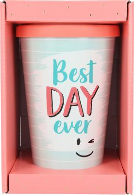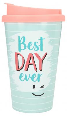 Dieser stylishe Trinkbecher mit dem Spruch Best DAY ever für unterwegs sorgt für beste Laune. Ob heißer Tee, kühle Limo oder Wasser: Dank der verschließbaren Trinköffnung geht nichts daneben.
