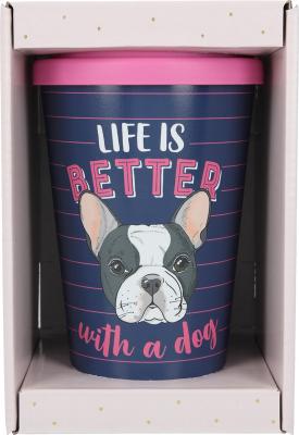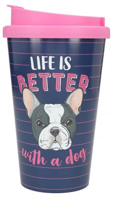 Dieser stylishe Trinkbecher mit dem Spruch Life is better with a dog für unterwegs sorgt für beste Laune. Ob heißer Tee, kühle Limo oder Wasser: Dank der verschließbaren Trinköffnung geht nichts daneben.