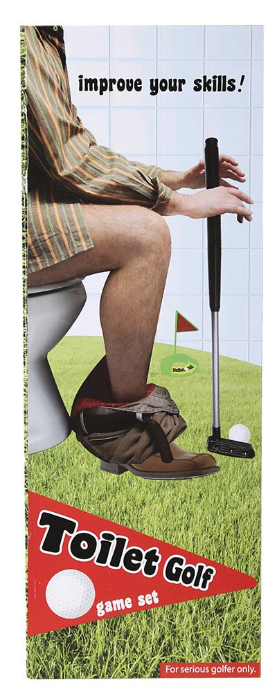 Mit einem Schläger, Ball, einem Loch mit Fähnchen und einem grünen Spielfeld als Toiletten-Vorlage wird das Einputten zum Spaß für Groß und Klein. Als Überraschungs-Gag auf der Toilette.