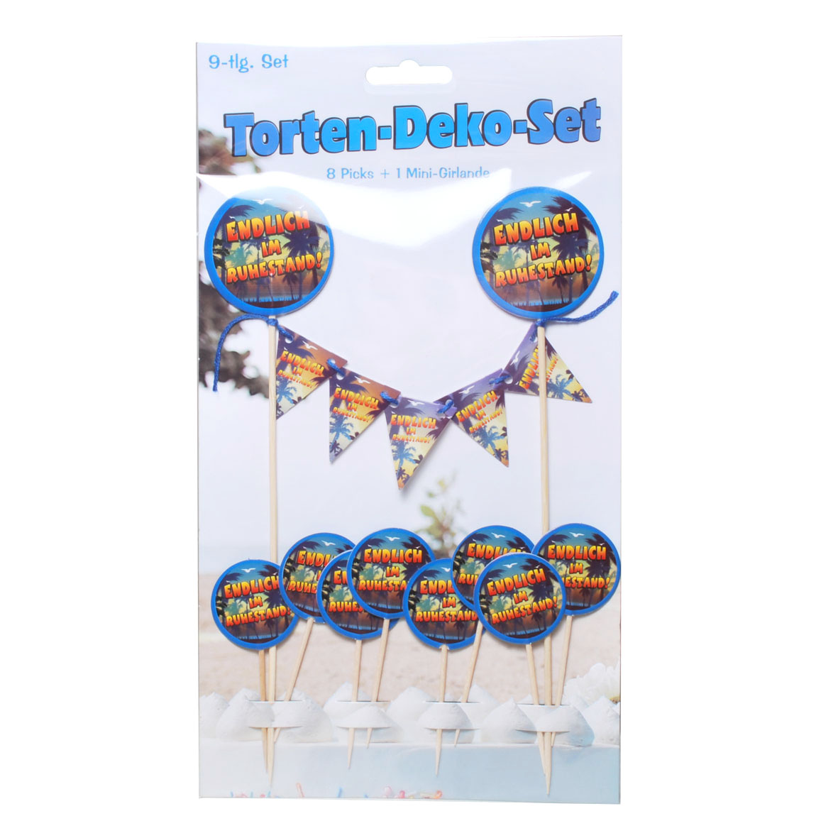 Die Wimpel-Girlande und die dekorativen Party-Picks sind mit einem zauberhaften Palmenstrand im Abendlicht verziert. Der Schriftzug „Endlich im Ruhestand“ auf jedem Element rundet das Design ab und vermittelt die Freude über den neuen Lebensabschnitt. Die Girlande ist an zwei stabilen Holzstäben befestigt und lässt sich ganz einfach in die Torte oder den Kuchen stecken. So entsteht im Handumdrehen eine fröhliche und entspannte Atmosphäre, die deine Gäste zum Staunen bringen wird.
