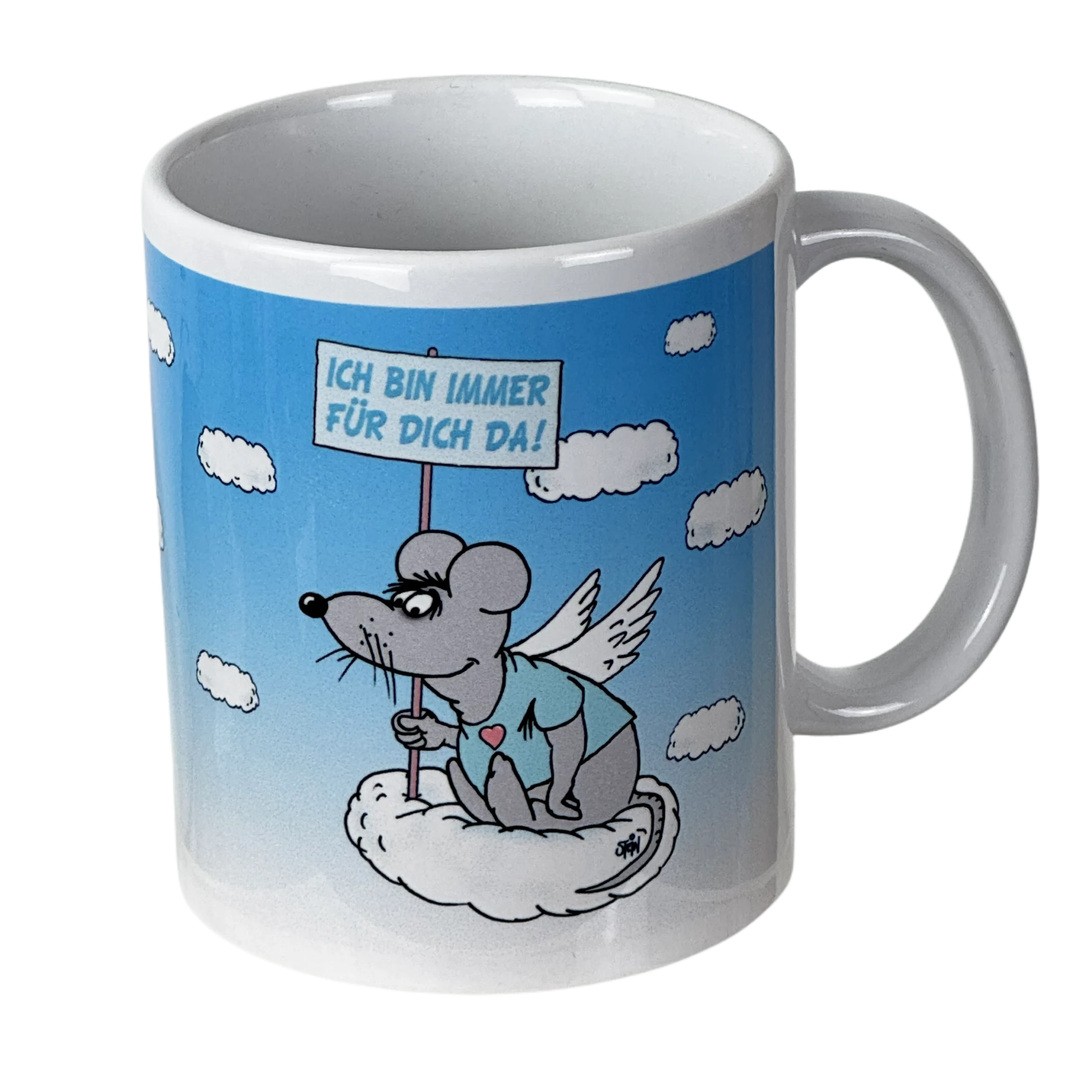 Der Uli Stein Becher „Schutzengel“ ist mehr als nur ein praktisches Alltagsutensil – er ist ein echtes Symbol der Fürsorge und Geborgenheit. Auf diesem bezaubernden Becher sitzt eine freundliche Maus mit Engelflügeln auf einer Wolke. Die Maus ist ein wahrer Schutzengel, der nicht nur gut aussieht, sondern auch eine liebevolle Botschaft übermittelt. Auf einer Seite des Bechers hält sie ein Schild mit der herzlichen Aufschrift „Ich bin immer für dich da!“. Eine Nachricht, die uns immer wieder daran erinnert, dass wir nicht allein sind – und das in den schönsten Momenten des Tages.