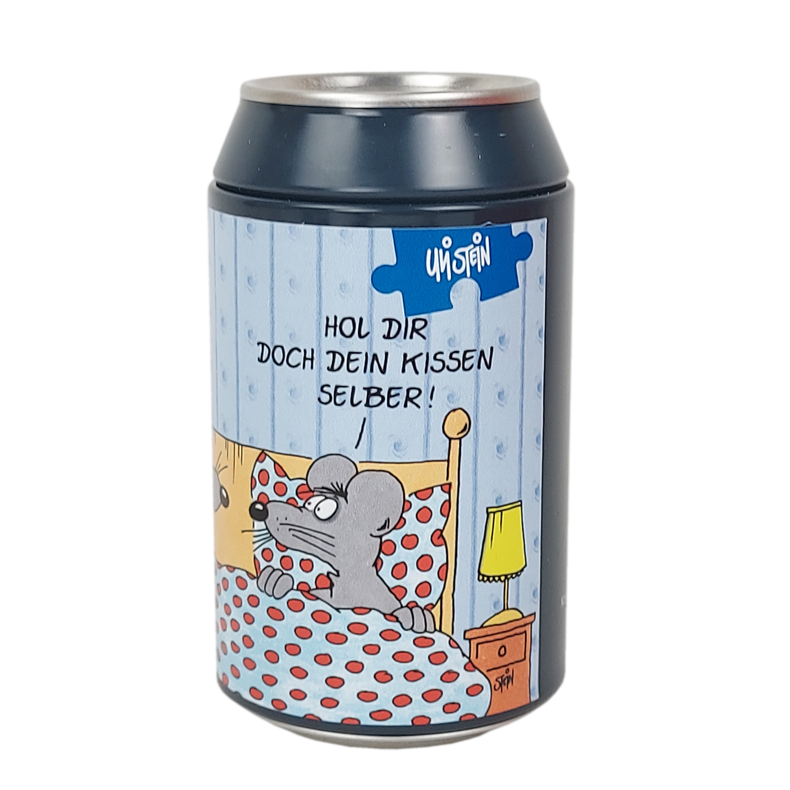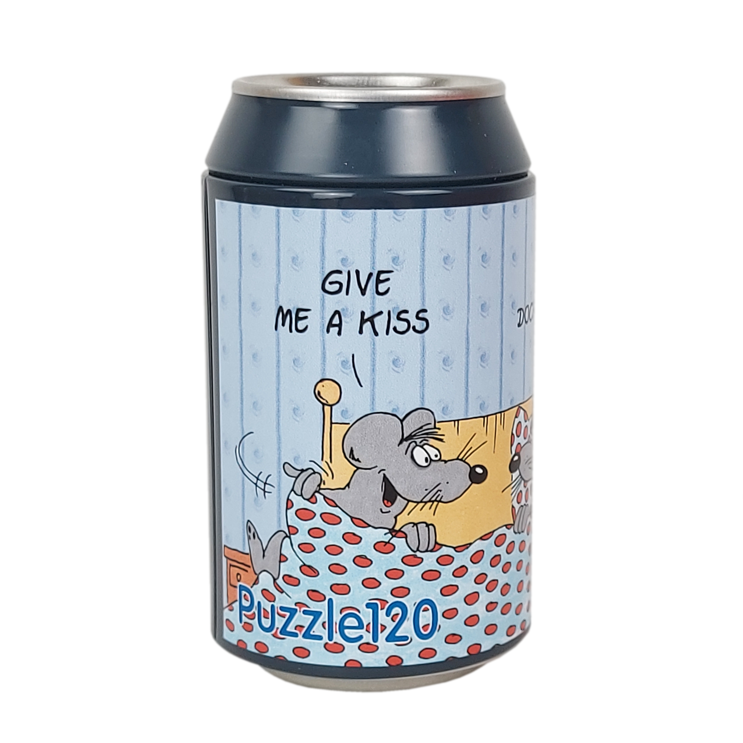 Verpackt in einer handlichen Dose, birgt dieses 120-teilige Puzzle eine einzigartige Szene. Das Motiv zeigt zwei niedliche Mäuse, die sich in ihrem Bett bereit zum Schlafen gemacht haben. Die eine Maus schaut liebevoll zur anderen und sagt: “Give me a kiss.” Doch die Antwort der zweiten Maus ist ebenso humorvoll wie unerwartet: “Hol dir dein Kissen doch selber!”