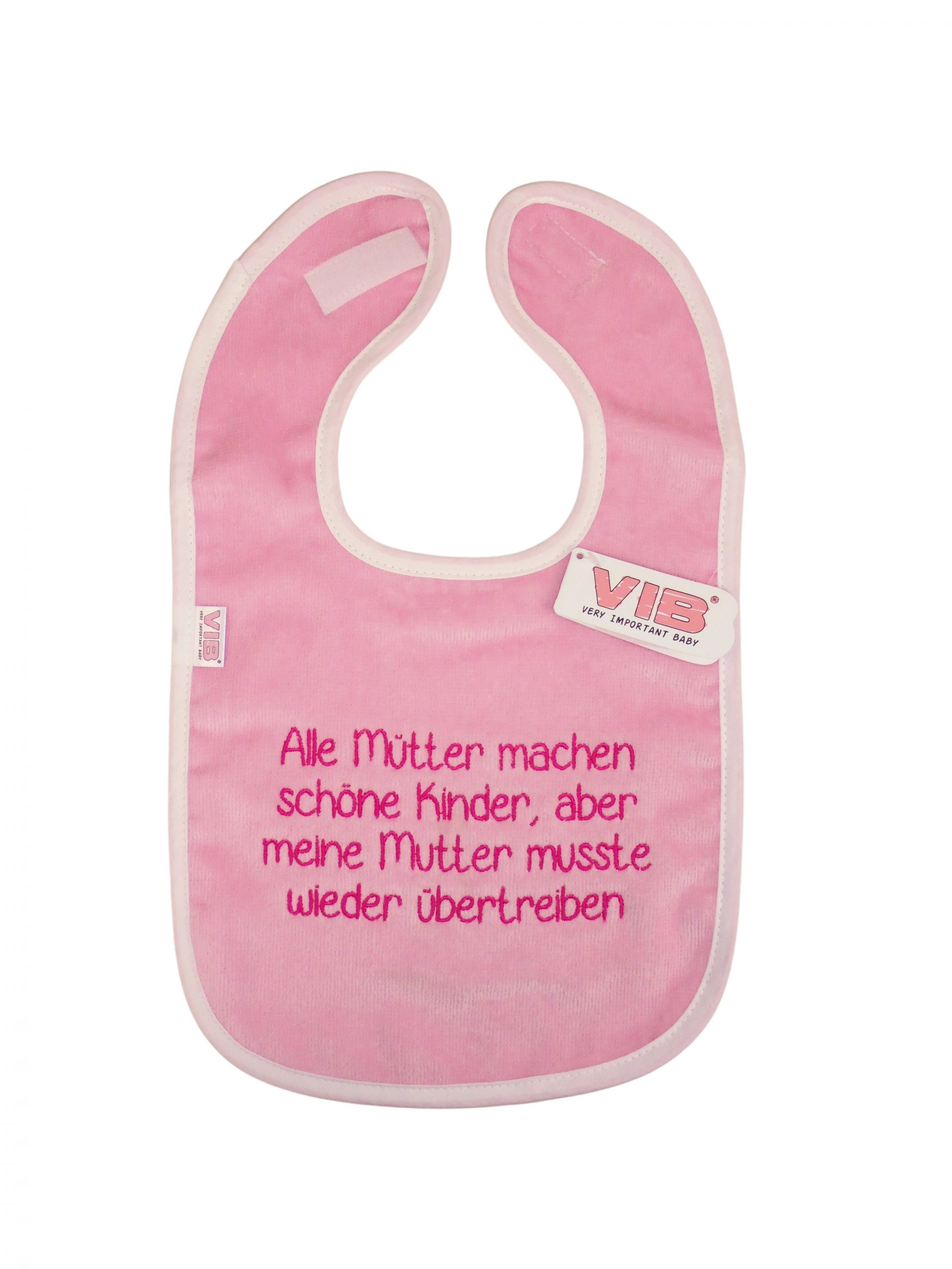 Das rosafarbene Lätzchen mit der Stickerei in pink: “Alle Mütter machen schöne Kinder, aber meine Mutter musste wieder übertreiben.” ist ein besonderes Lätzchen für alle Babys und deren frisch gebackenen Eltern.