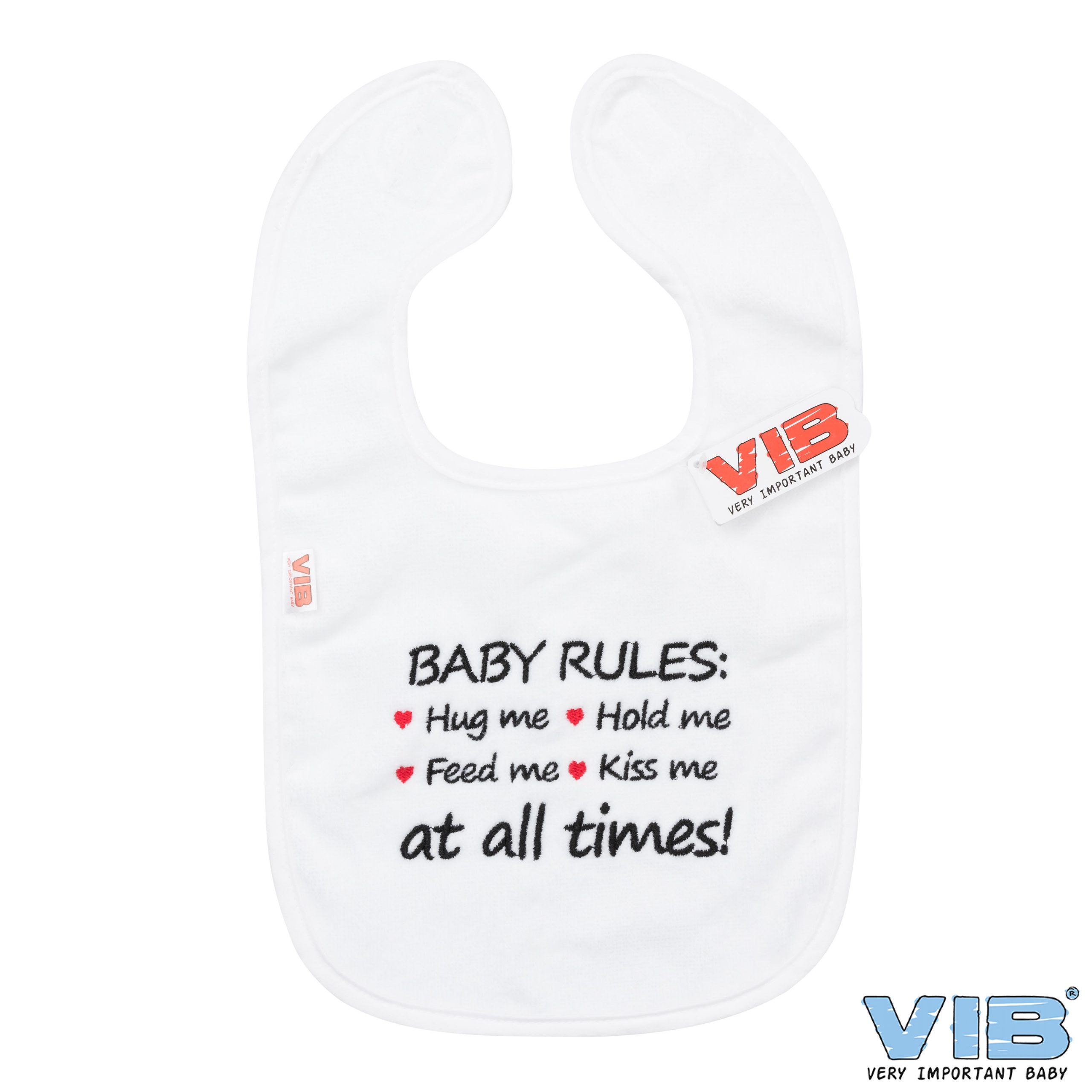 Das weiße Lätzchen mit der edlen schwarzen Stickerei: “Baby Rules: Hug me, Hold me, Feed me, Kiss me at all times!” und den kleinen roten Herzen, ist ein besonderes Lätzchen für alle Babys und deren frisch gebackenen Eltern.