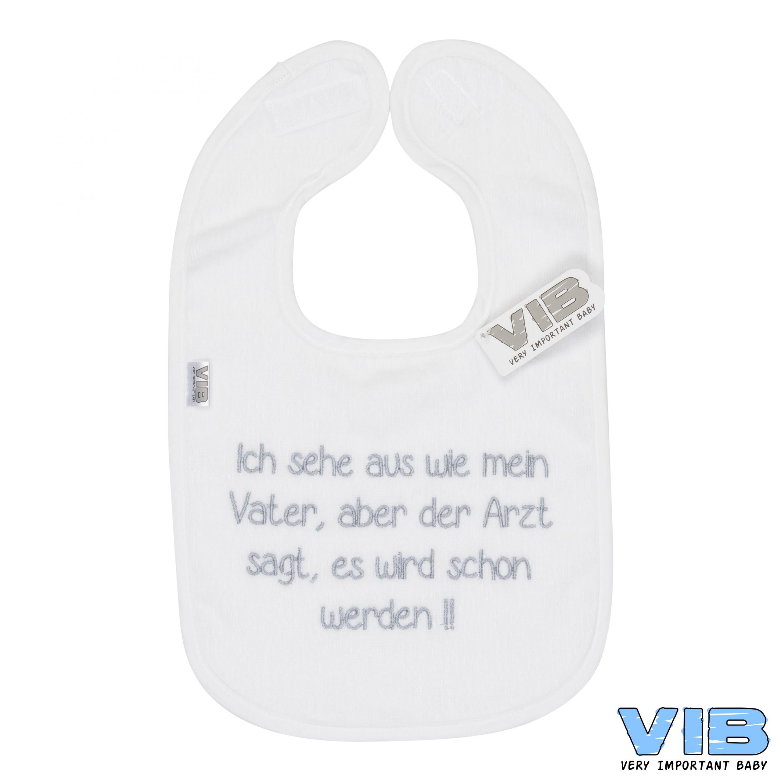 Das weiße Lätzchen mit der edlen silbernen Stickerei: “Ich sehe aus wie mein Vater, aber der Arzt sagt, es wird schon werden!!” ist ein besonderes Lätzchen für alle Babys und deren frisch gebackenen Eltern.