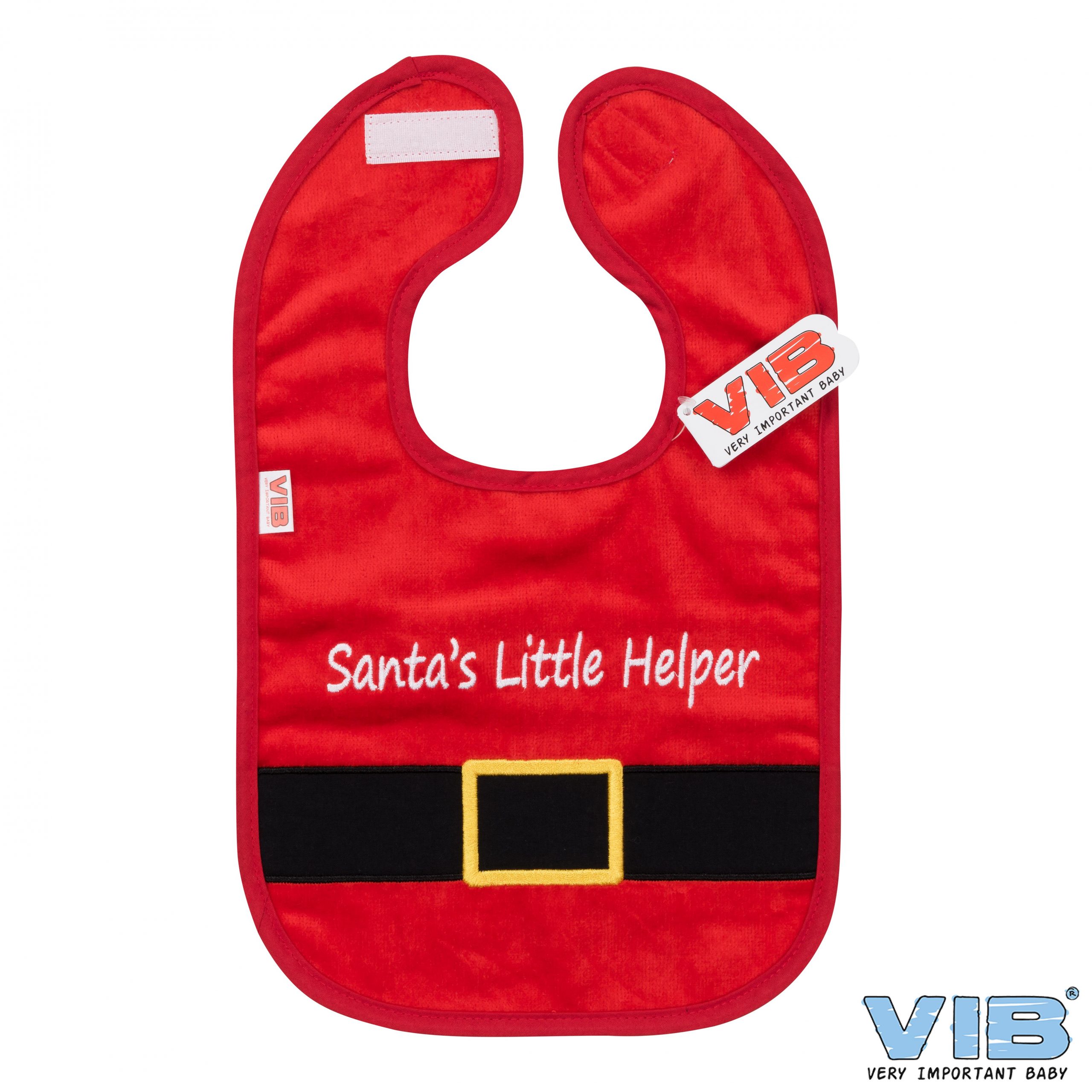 Das rote Lätzchen mit der roten Einfassung, der Stickerei: “Santa`s Little Helper” und dem angedeuteten Gürtel ist ein besonderes Lätzchen für alle Babys und deren frisch gebackenen Eltern. Dazu passend die kleinen Weihnachts- Schühchen von VIB.