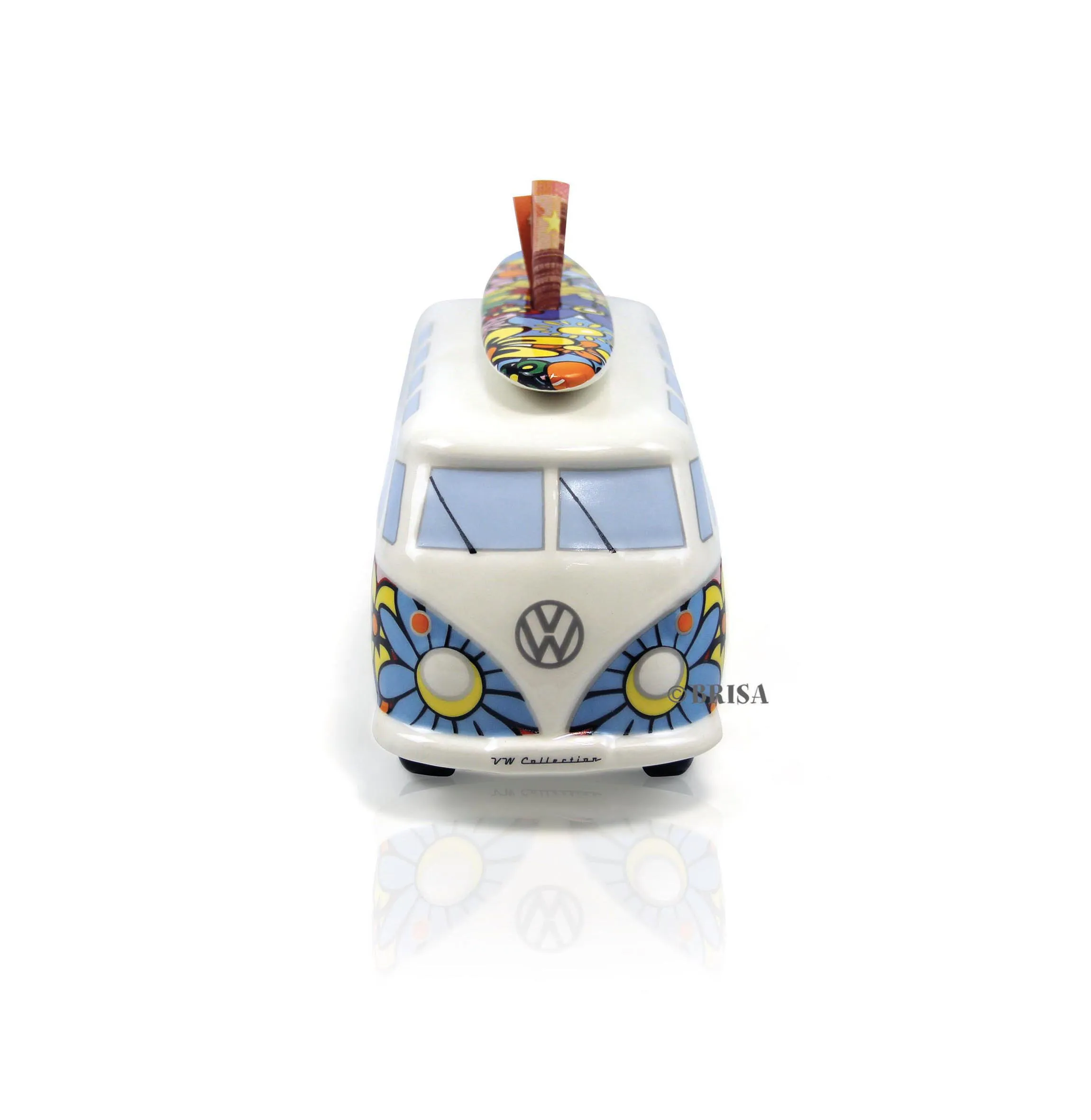 Jeder VW Bus ist ein kleines Unikat, weil die detailgetreue Bemalung mit großer Sorgfalt erfolgt. Auf dem Dach befindet sich ein Surfbrett in Wagenfarbe, das nicht nur optisch überzeugt, sondern auch als Münzschlitz dient. Dadurch verbinden sich Design und Funktion sinnvoll. Auf der Unterseite sorgt ein Gummipfropfen für bequemes Entnehmen des Geldes, sodass Sie jederzeit Zugriff haben. Da kein Hammer notwendig ist, bleibt die Spardose dauerhaft nutzbar und begleitet Sie über viele Jahre.